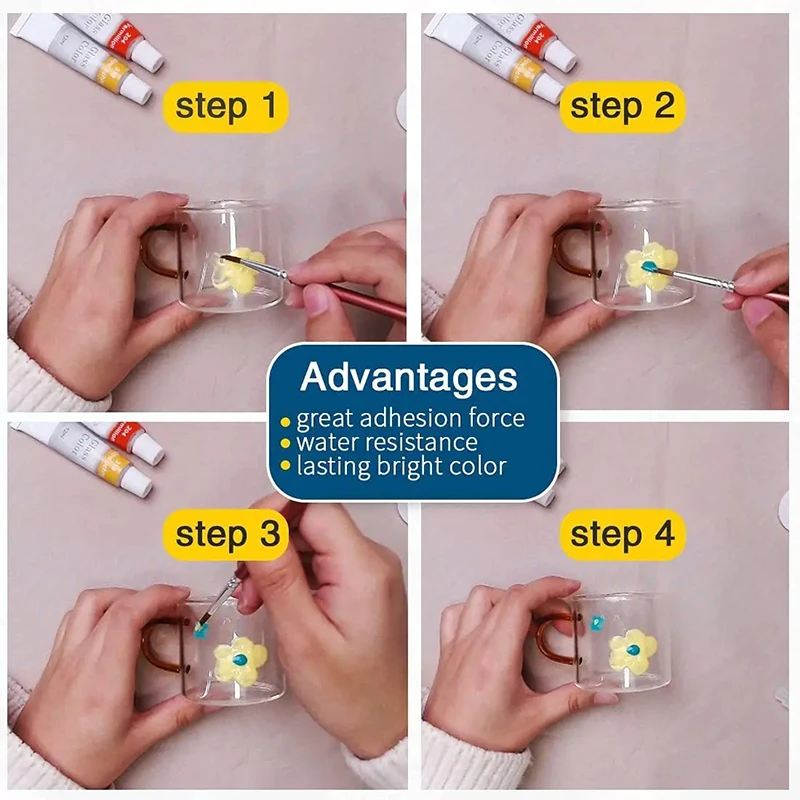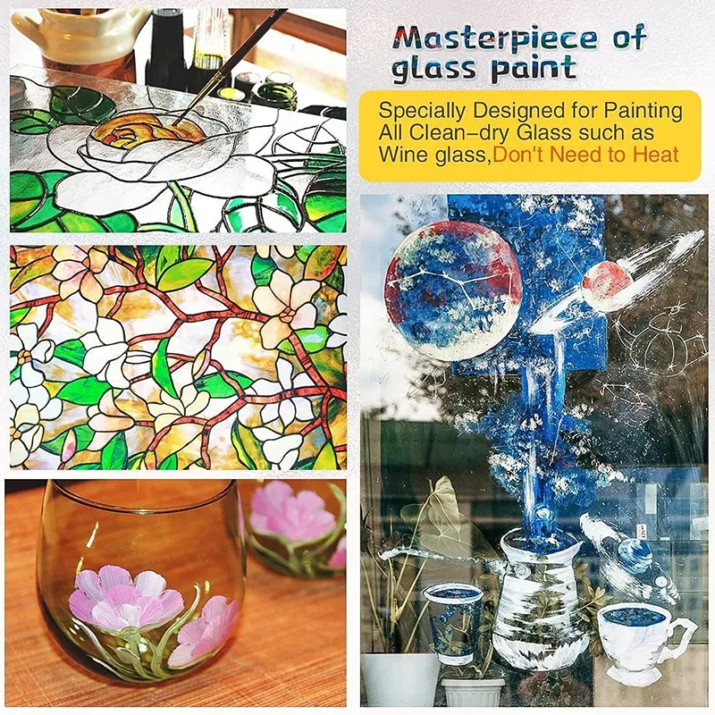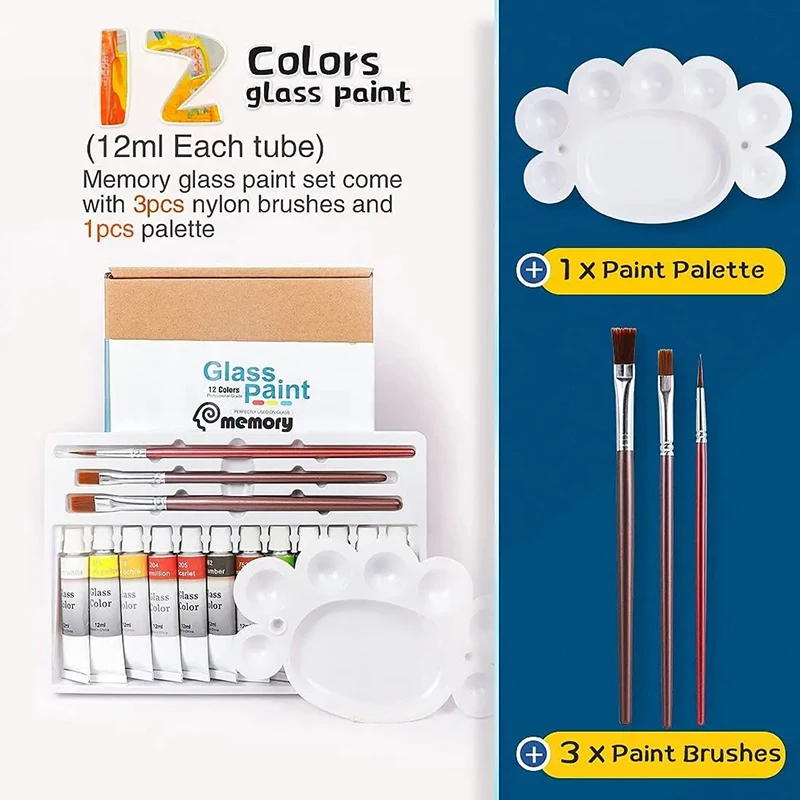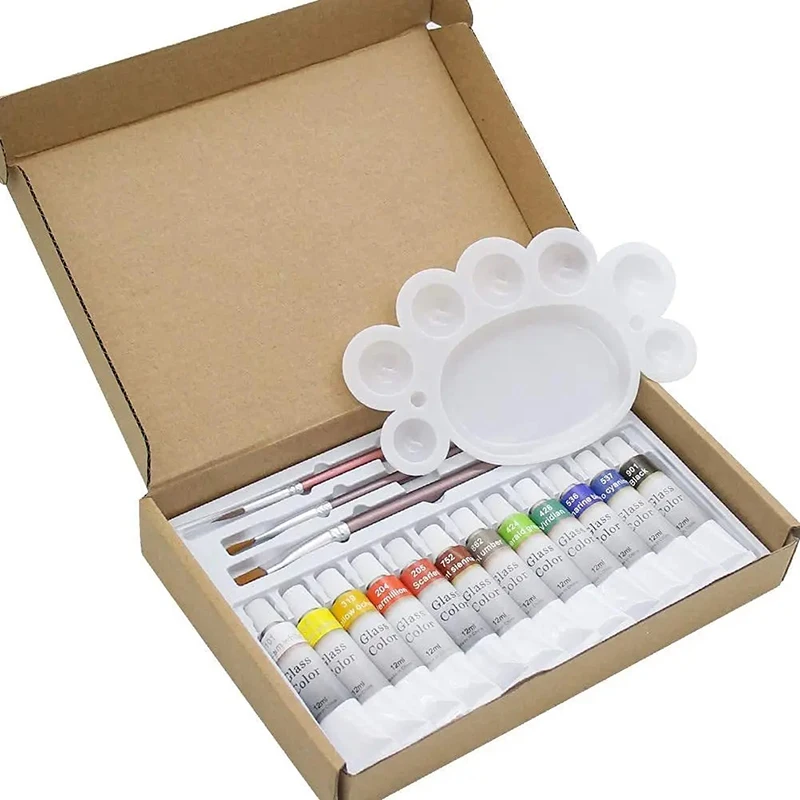 12 24 Colors Stain Glass Paint Set with 6 Nylon Brushes, 1 Palette, Waterproof Acrylic Enamel Painting Kit for Art Supplies