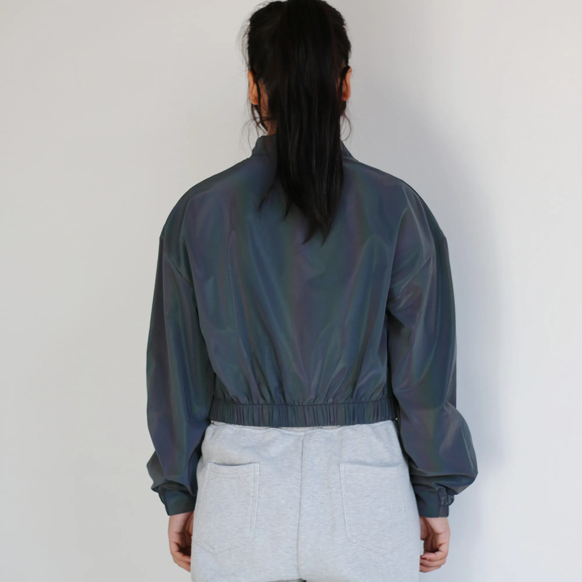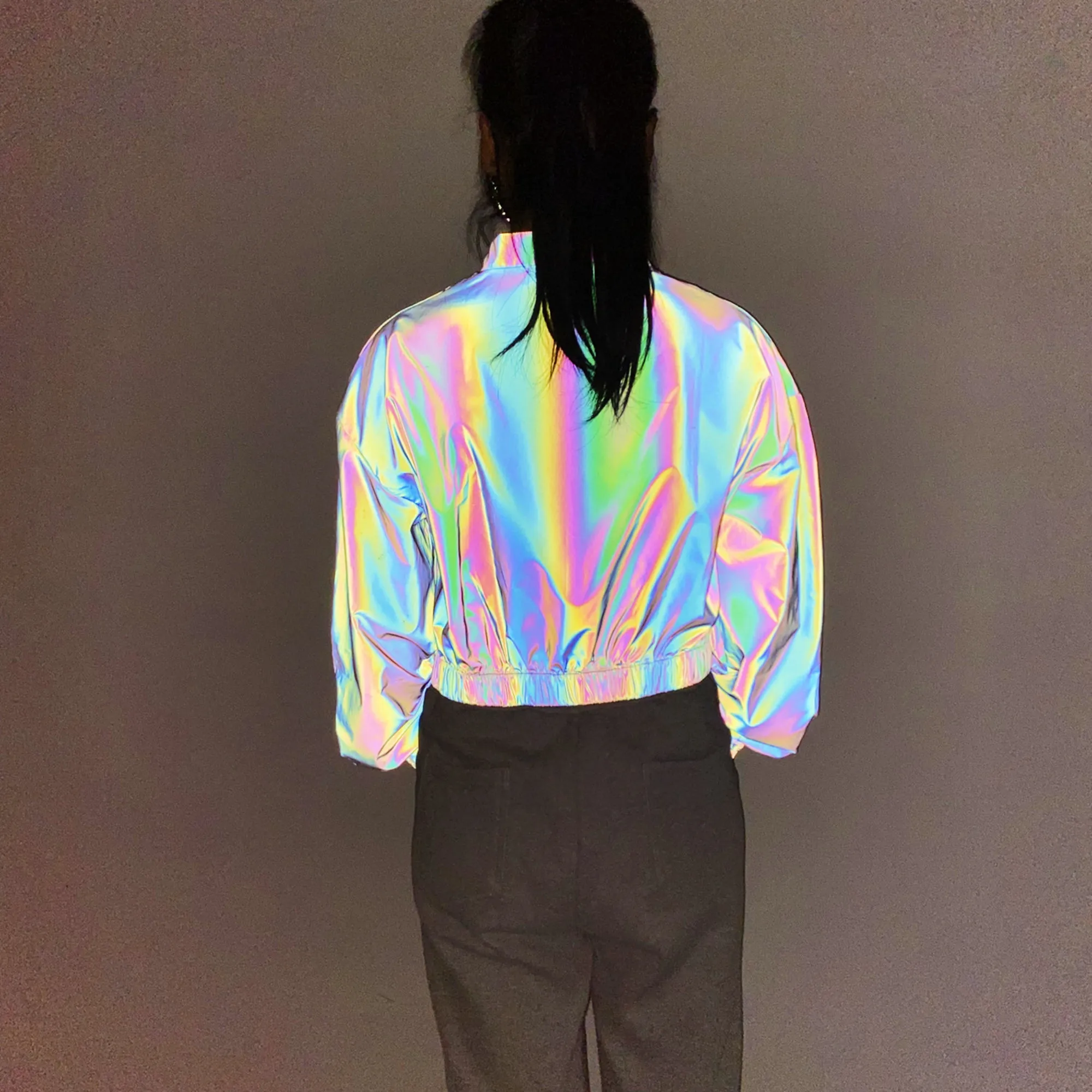 Women's Holographic Reflective Rainbow Casual Stand-up Collar Jacket Reflective Rave Rainbow Short Outerwear Jacket Outfit