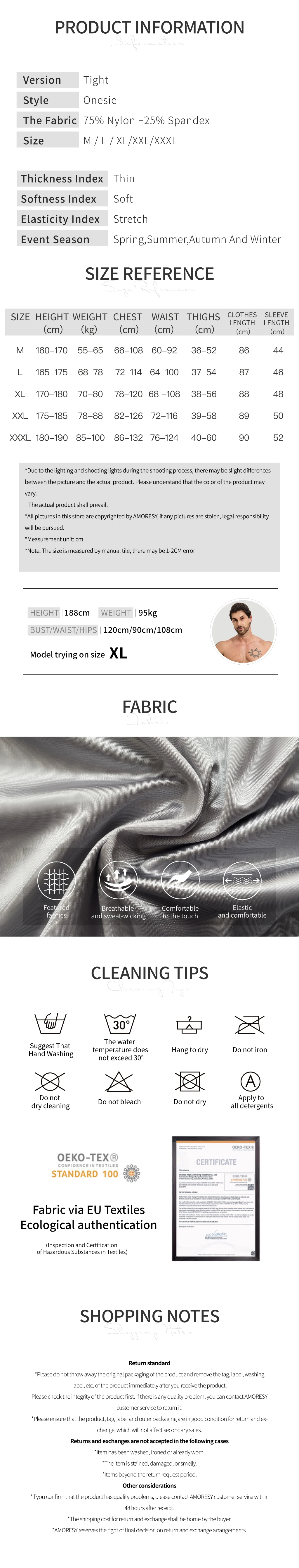 AMORESY Men Glossy Satin One Piece Tights Front Zipper Long Sleeve Spandex Sports Jumpsuit Fitness Gymnastics Overalls Bodysuits