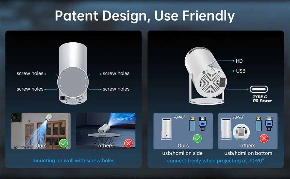 - User Friendly Patent Projector Body Design, it is an ideal partner to enjoy your time, and it can providing a comprehensive experience in the daily use.