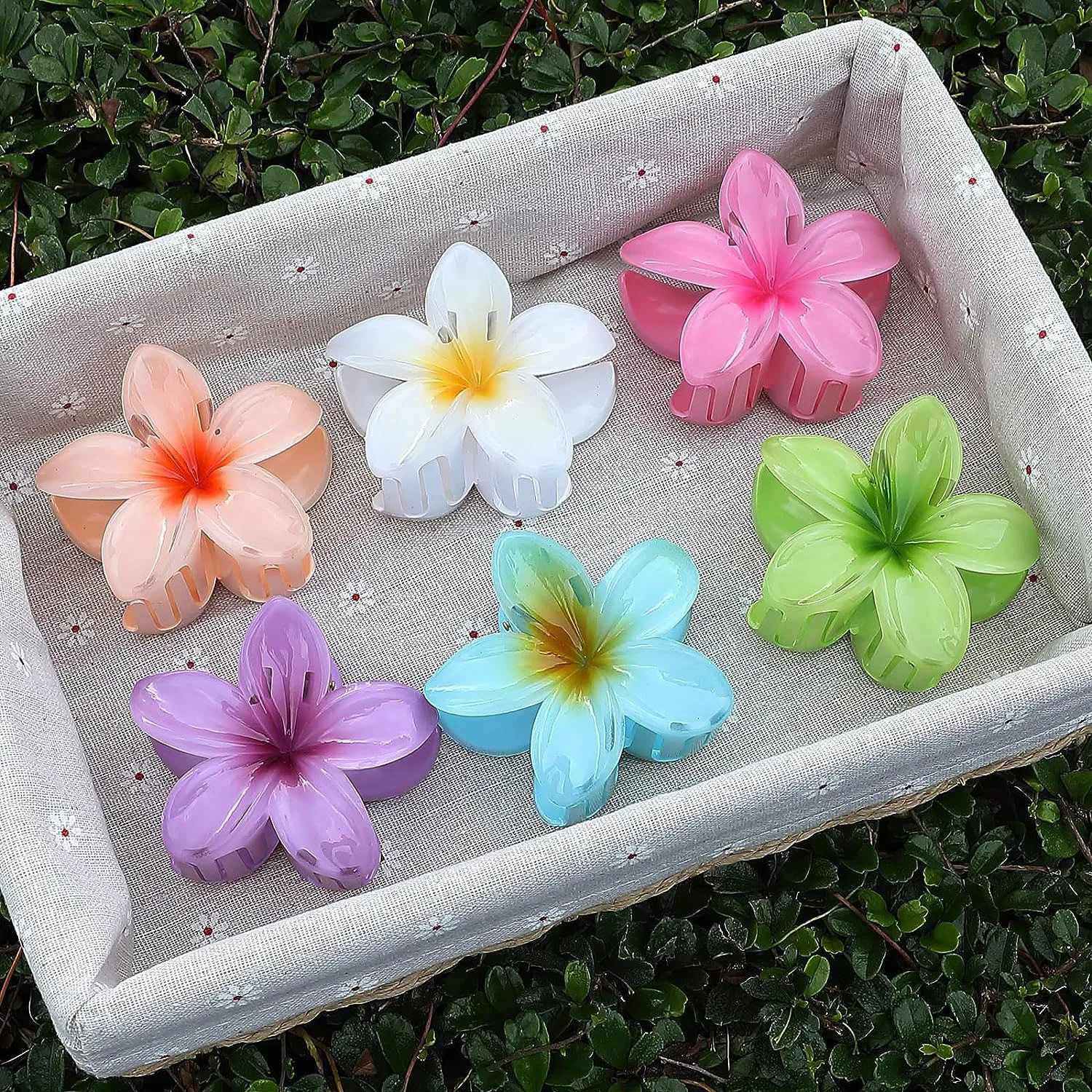 Different Colors: 6 packs flower claw clips in one package. Different colors including Yellowish White, Pink, Purple, Orange, Green, Blue.