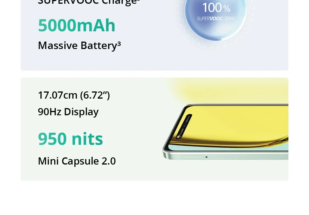 • SuperVOOC Fast Charging:With 33W fast charging speed, this phone can quickly replenish battery life, reducing downtime and enhancing user convenience.