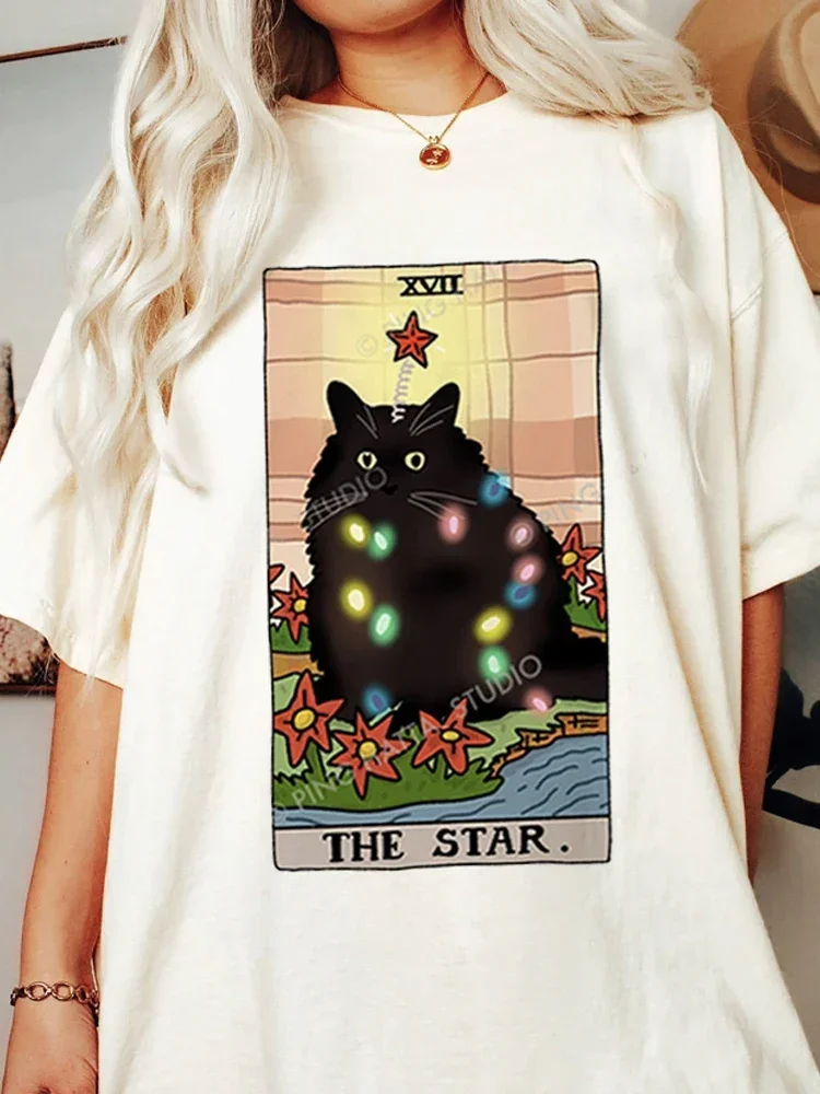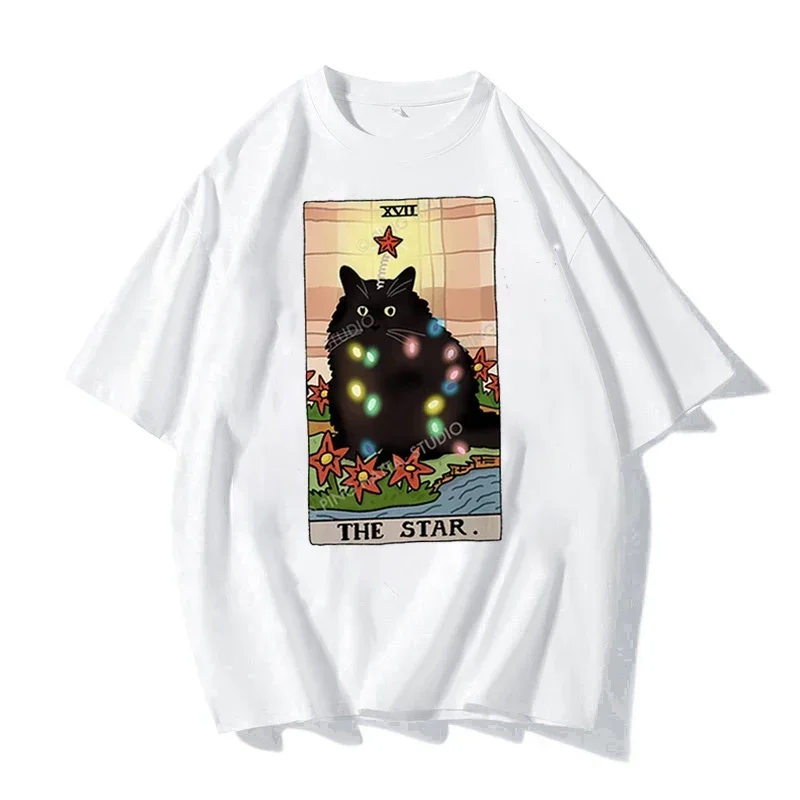 Harajuku 90s Women's New Casual Kawaii Tarot Cat Graphic Print high street Loose Oversize O Neck Short Sleeve Tops Tees Unisex