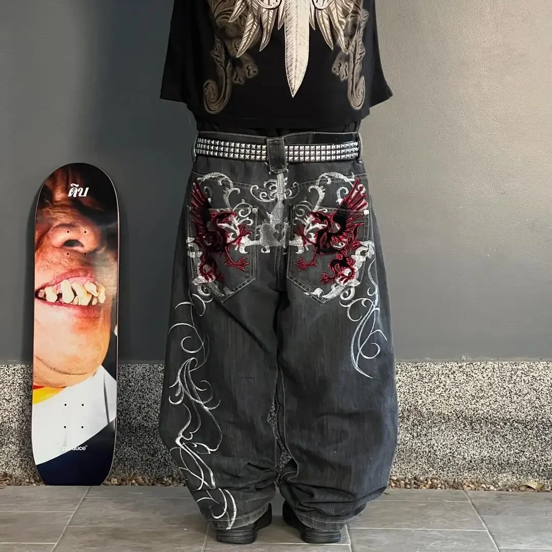 Hip-hop Retro Street Casual Y2k Women's Harajuku Fashion Trend Embroidery Pattern Denim Trousers Straight Wide Leg Pants For Men