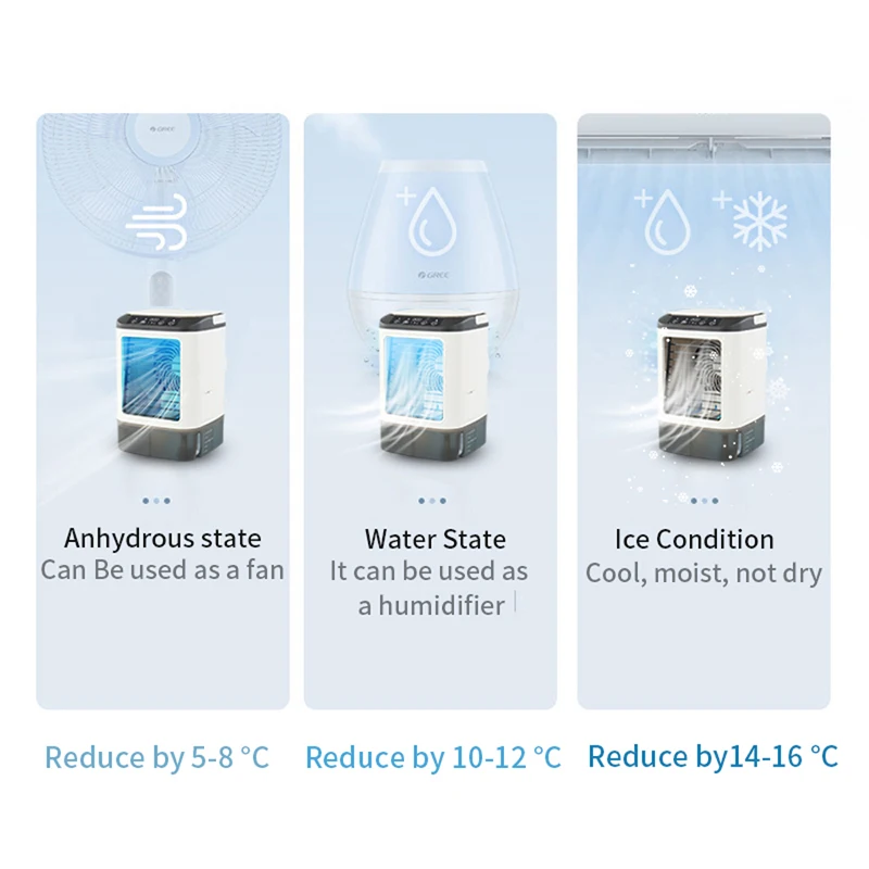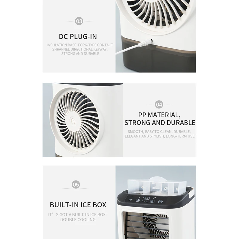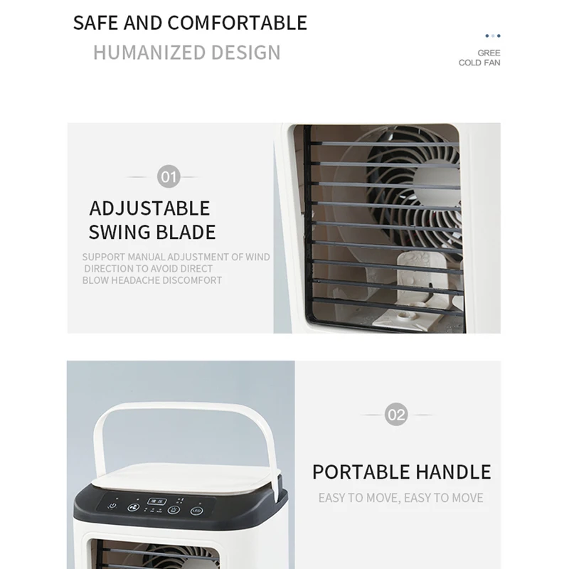 【MULTI-FUNCTIONAL Personal Fan】This mini air conditioner integrates air coo-ling, spray humidification functions and is equipped. Different from other micro portable ac air conditioners, this evaporative cooler can cool the air and keep the skin moisturized.The product is equipped with an ice tray, and the coolin-g effect is better when used together.