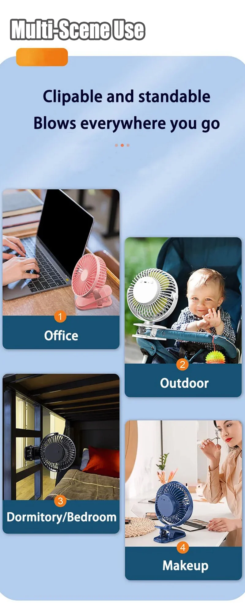 • Adjustable Clip-on Design :The clip-on design allows for easy adjustment of the fan's angle, ensuring maximum coverage and comfort.