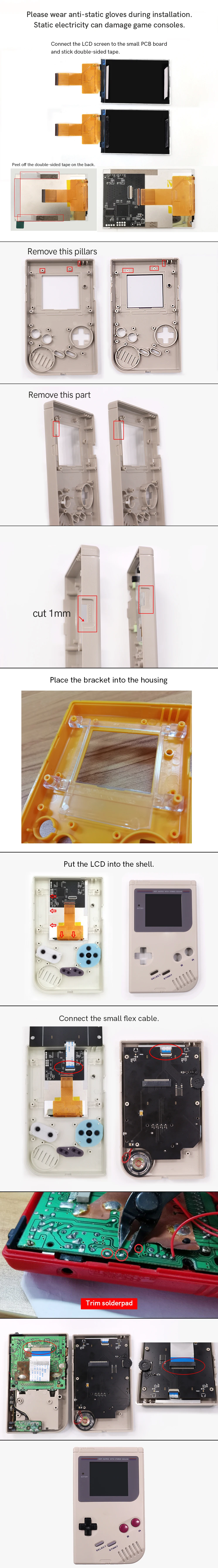 Replace the old, broken or cracked LCD screen with backlight.Make your DMG console display colorfully.The advantage of our GB DMG backlight LCDs are as bellow:1. Built-in OSD Menu.2. Built-in 36 color modes, Each 'color mode' can be adjustable. Each color mode can change to 65,536 different color!3. Same screen display area (The original screen lens will work well on it. No need customised screen lens)4. Retro pixel Effects: Normal, Scanline.5. FRM On/OFF function(Frame blending On/OFF) is included. For some extremly few games, the image effect will be better.6. Image vertical position adjustable.7. 20 brightness levels.8. Battery level display On/OFF9. Wide View angle up to 178 degree10.Easy to install11. No need welding excluding 2 speakers.12. Spin the Knob to adjust the brightness, Press the Knob to change the coloful models. Inclue:1. backlight LCD.2. two PCB.3. two cables.4. 3D Bracket free.5. Double-sided tape.6. Screwdrivers.7. pre-cut shell case if you choose.Instruction