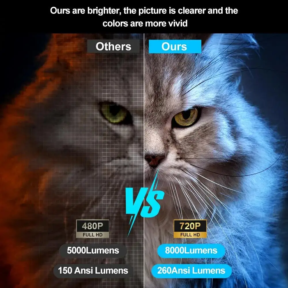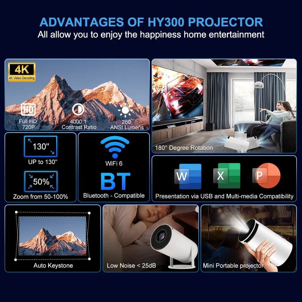 - 180°flexible projection angle,can projecting where you want- 130"screen projection display- low noise low price, portable ,delicate holding with one hand,outdoor projection easier- You can comprehensively correct the picture by the remote control, no matter which angle- Bulb Life 50000 Hrs- Image FileJPG,BMP,PNG,support image scaling- Video FileFull-format decoding including HEVC/VP9/AVS2/AVC 4K@60fps and MPEG1/MPEG2/AV1 1080p/60fps decoding and so on Pls note our projector can support 4K video decode, but output video highest resolution is 1280*720P. Precautions:When there is a situation where Netflix, Disney, and other software constantly need to be updated and cannot log in to the account normally, please do not worry. This is because the software of the product itself is not certified by Google, so it cannot be directly updated on Google Mall. All the same projectors on the market are not certified, but we have a solution for this situation. Customers who encounter this situation should contact customer service as soon as possible, The customer will send you a solution and follow the one provided by the customer to solve any problems they encounter! Native 720P Resolution & 4K Video decodingImmerse yourself in stunning visuals as our projector supports high-definition 1920x1080P resolution. Full-format decoding including HEVC/VP9/AVS2/AVC 4K@30fps and AV1/MPEG1/MPEG2 1080p/30fps decoding and so on. Elevate your viewing with sharper details and embrace the future of projection technology.