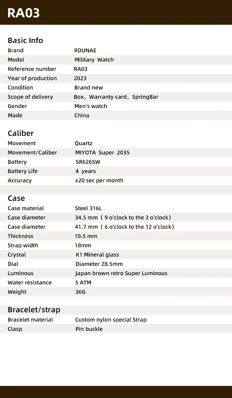RDUNAE 34.5mm 2024 New Top Quartz Watches For Men Retro G10 Military Miyota 2035 Movemen Watches Mineral relogios masculino