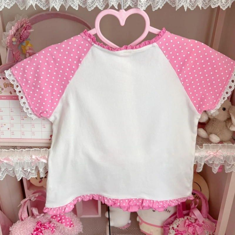 Sweet Crop Top Grunge Cartoon Print Lolita T-shirt Women Y2k Aesthetic Ruffle Harajuku Contrast Color Tee Vintage Fairy Japanese