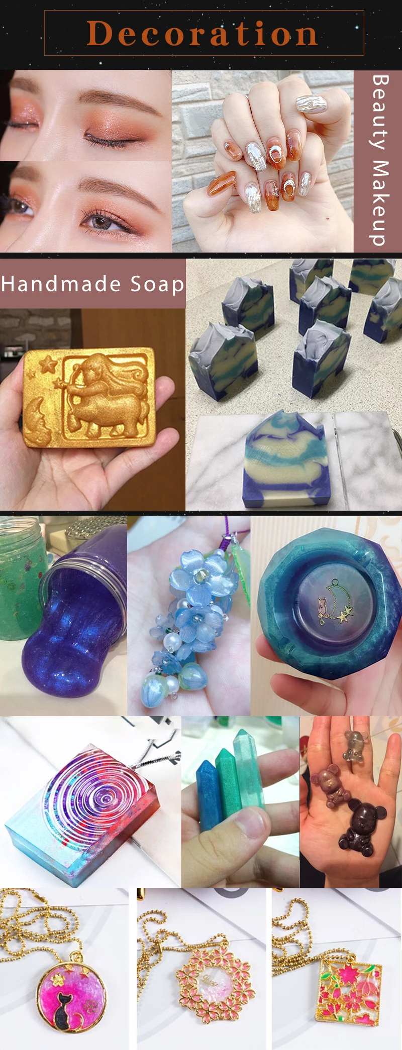 | Application | cars, motorcycles, bicycles, paint, printing inks, cosmetics, furniture, art fonts, plastics, ceramics, leather, (leather ), handicrafts, textiles, Buddha, paper, incense, toys, decorations, and other high-end products | |