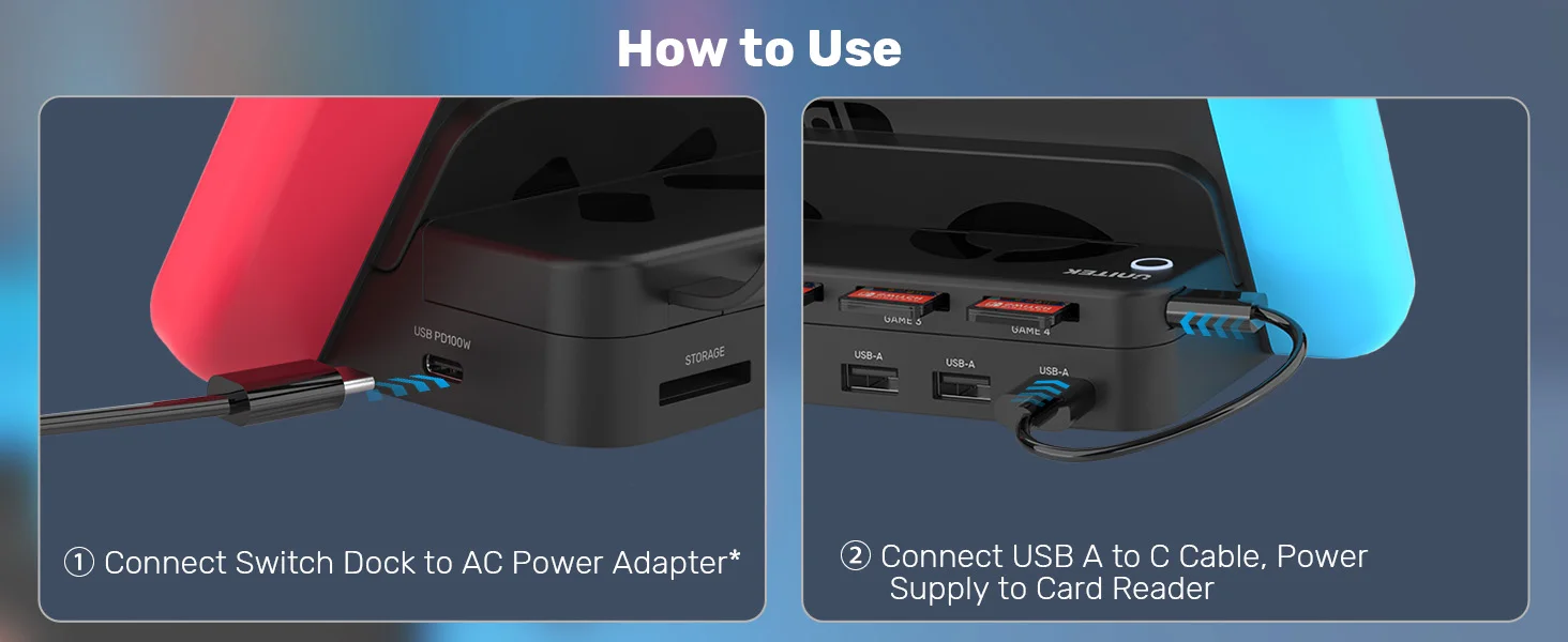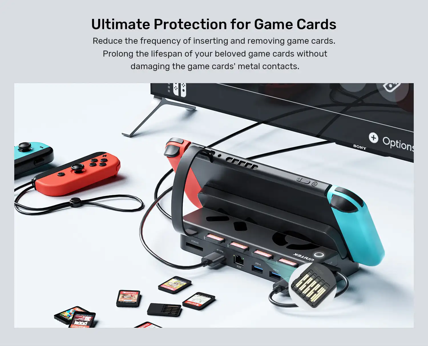 This game card adapter for the Nintendo Switch comes with 3 anti-slip and anti-scratch clips, allowing the Unitek game card reader to be securely attached to the Switch docking station. You don't have to worry about blocking the ventilation vents and affecting console heat dissipation.