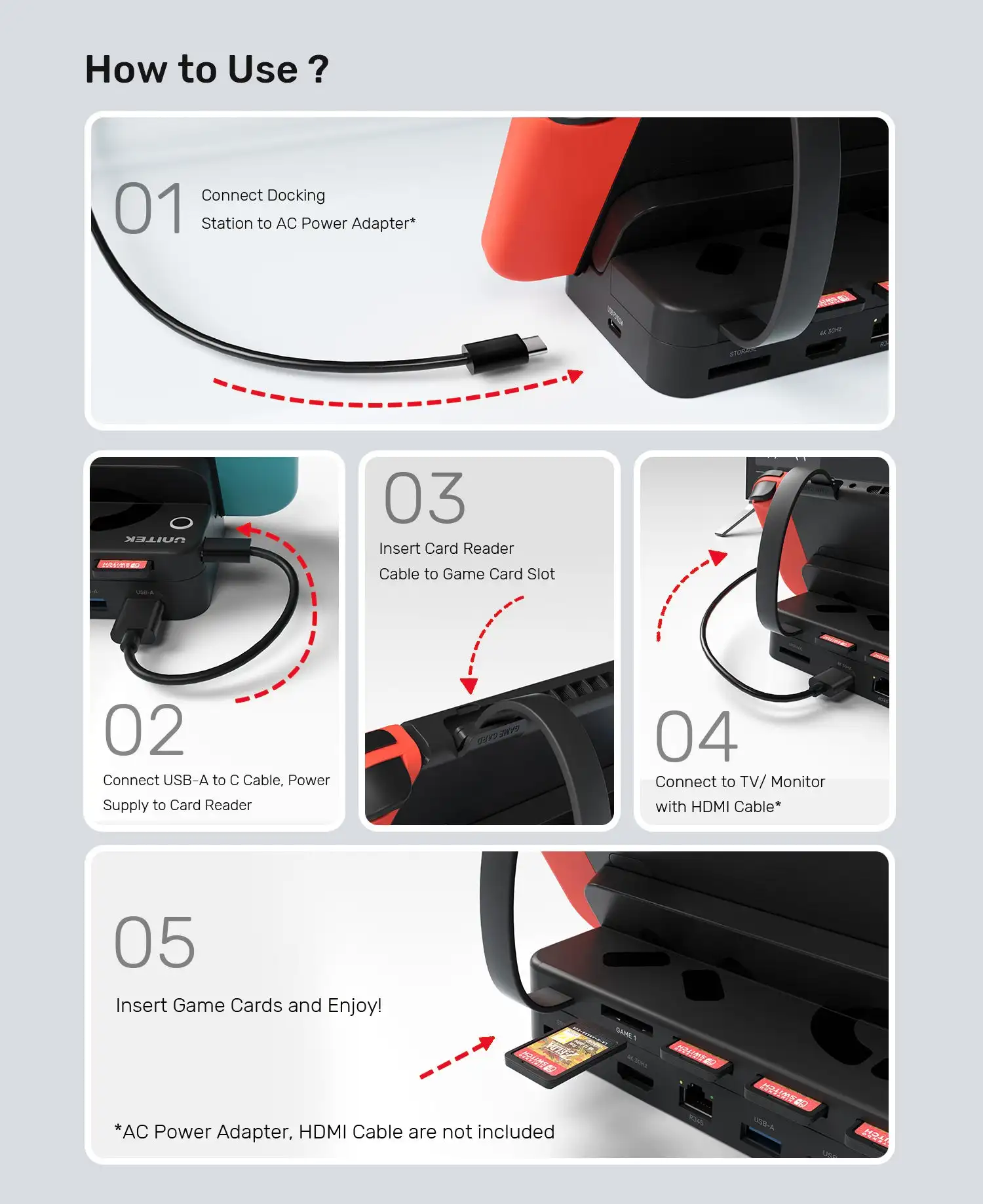 Unitek Switch Game Card Reader with Wireless Remote Control for Nintendo Switch OLED Docking Station to HDMI RJ45 PD 100W Charge