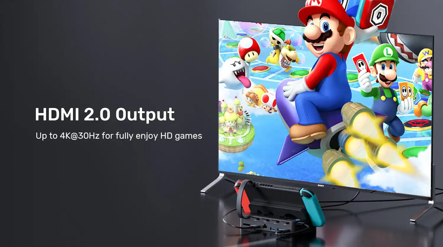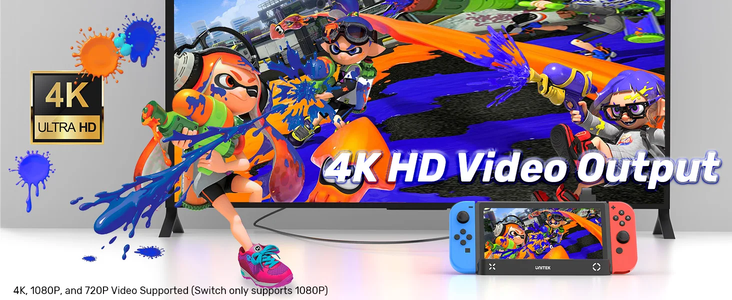 UNITEK Nintendo Switch docking station supports 4K, 1080P and 720P video output*, allowing users to stream vivid media files to TV, projectors, and much more.