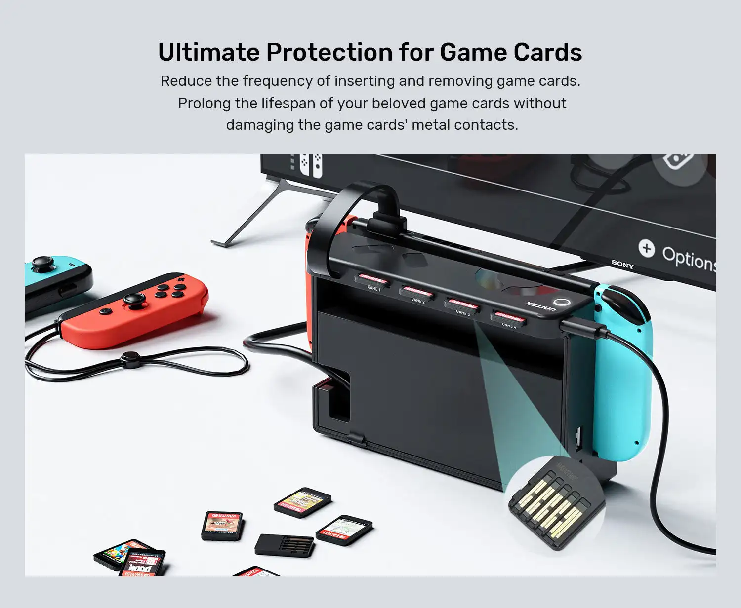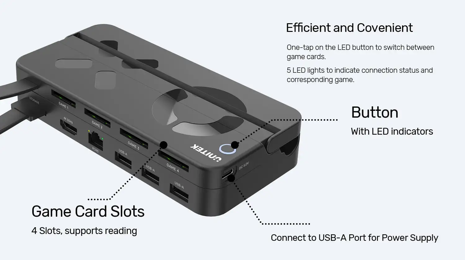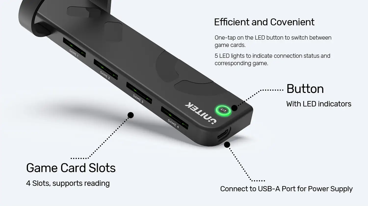 This UNITEK Switch game cards reader is compatible with Nintendo Switch/ Switch OLED, and supports reading 4 game cards. Users can quickly switch games by pressing one button, without the hassle of inserting and removing game cards.