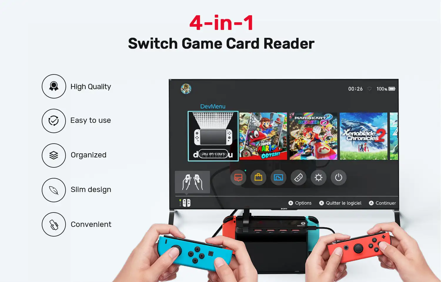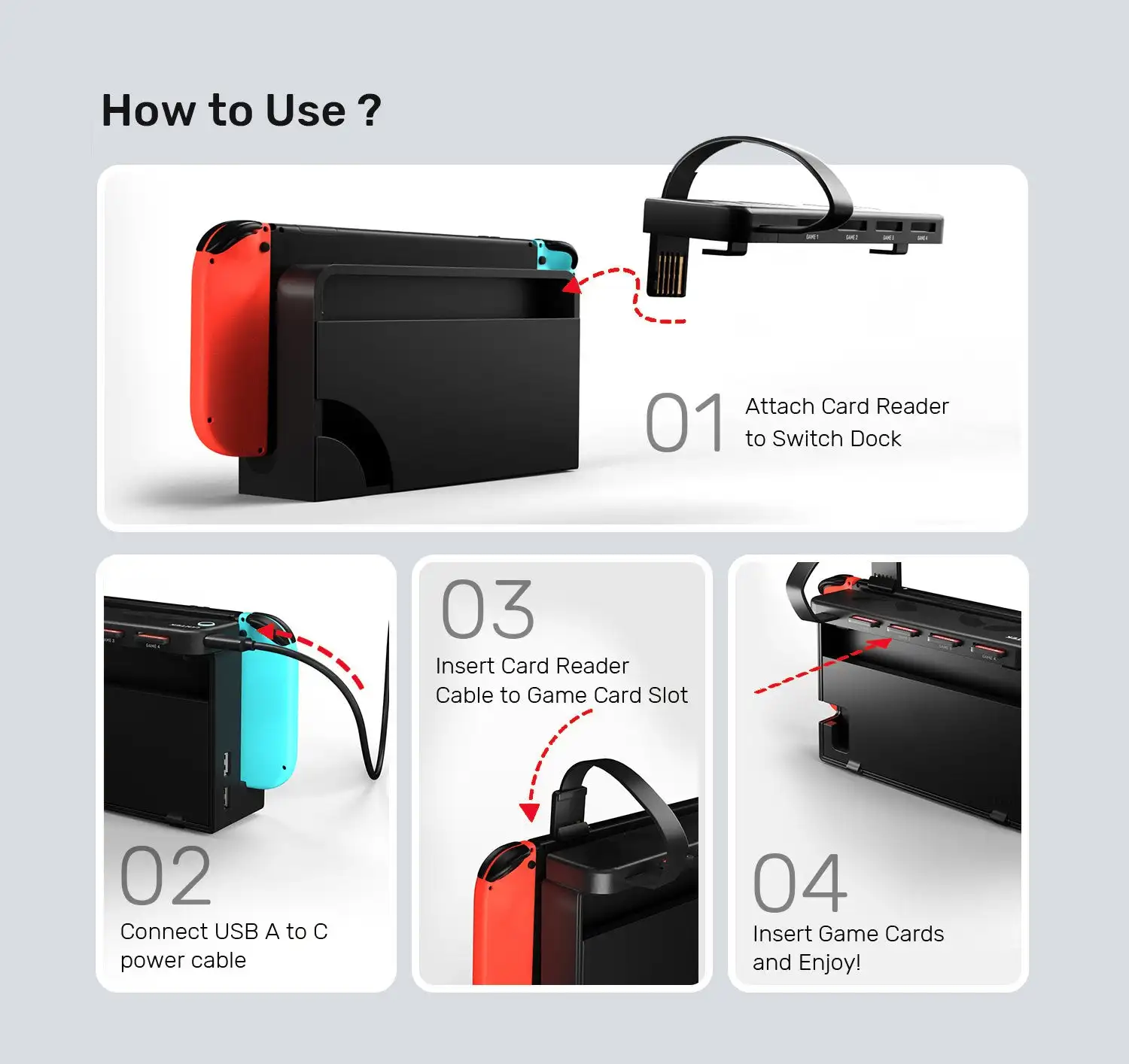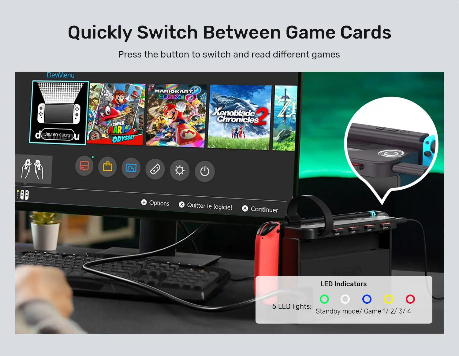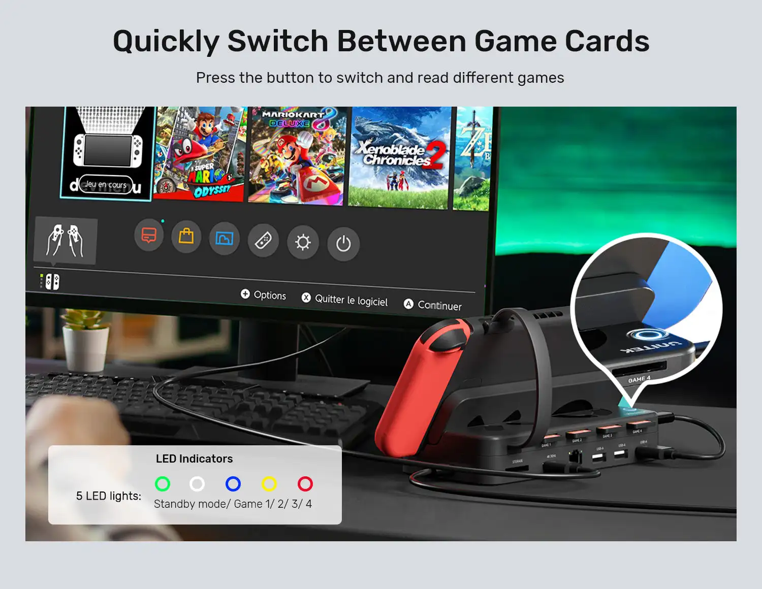 This UNITEK Switch game cards reader is compatible with Nintendo Switch/ Switch OLED, and supports reading 4 game cards. Users can quickly switch games by pressing one button, without the hassle of inserting and removing game cards.