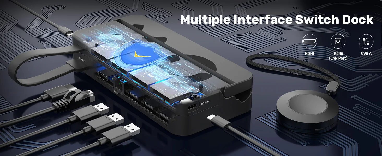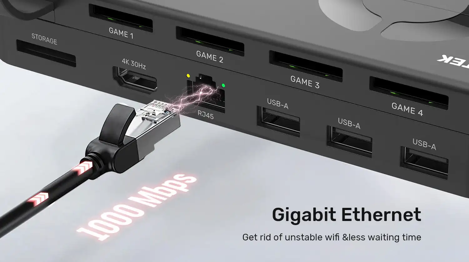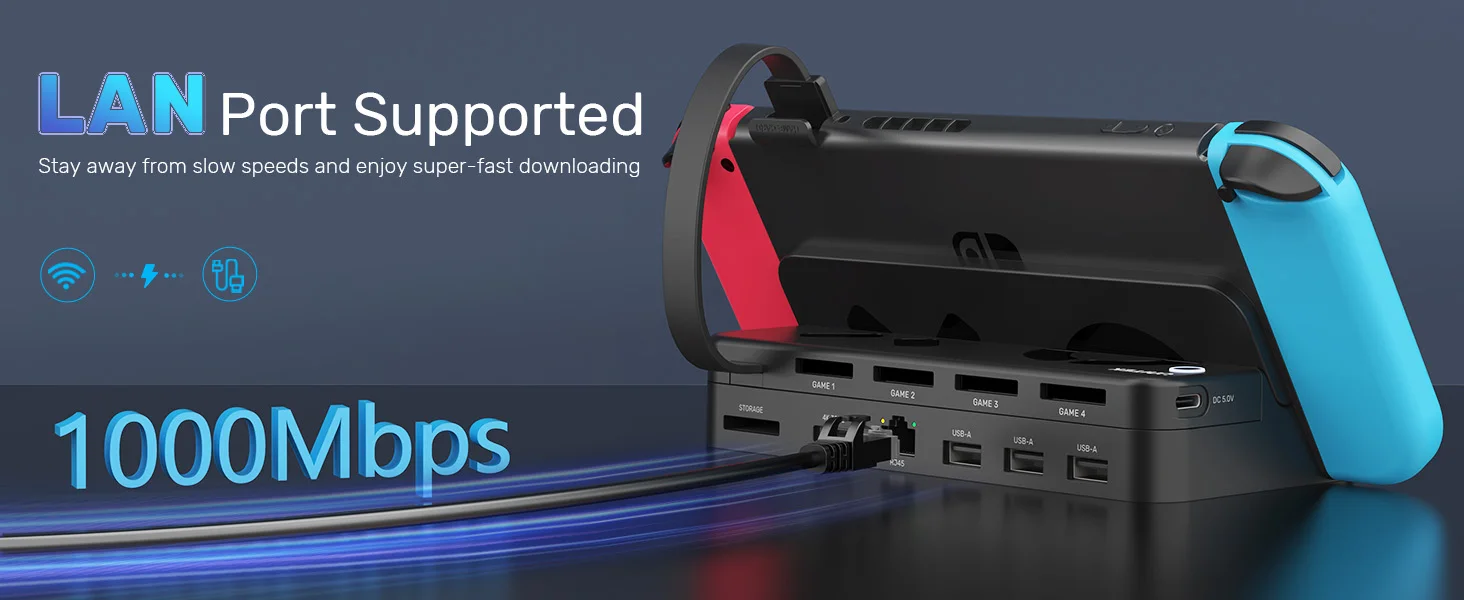 This UNITEK switch docking station performs much more than the official switch dock. It supports 4 games switching by pressing the button and is equipped with HDMI video output, USB-C (power supply), 3 USB ports and a RJ45 Gigabit Ethernet port, allowing you and your friends to play multiple games without changing the cards.