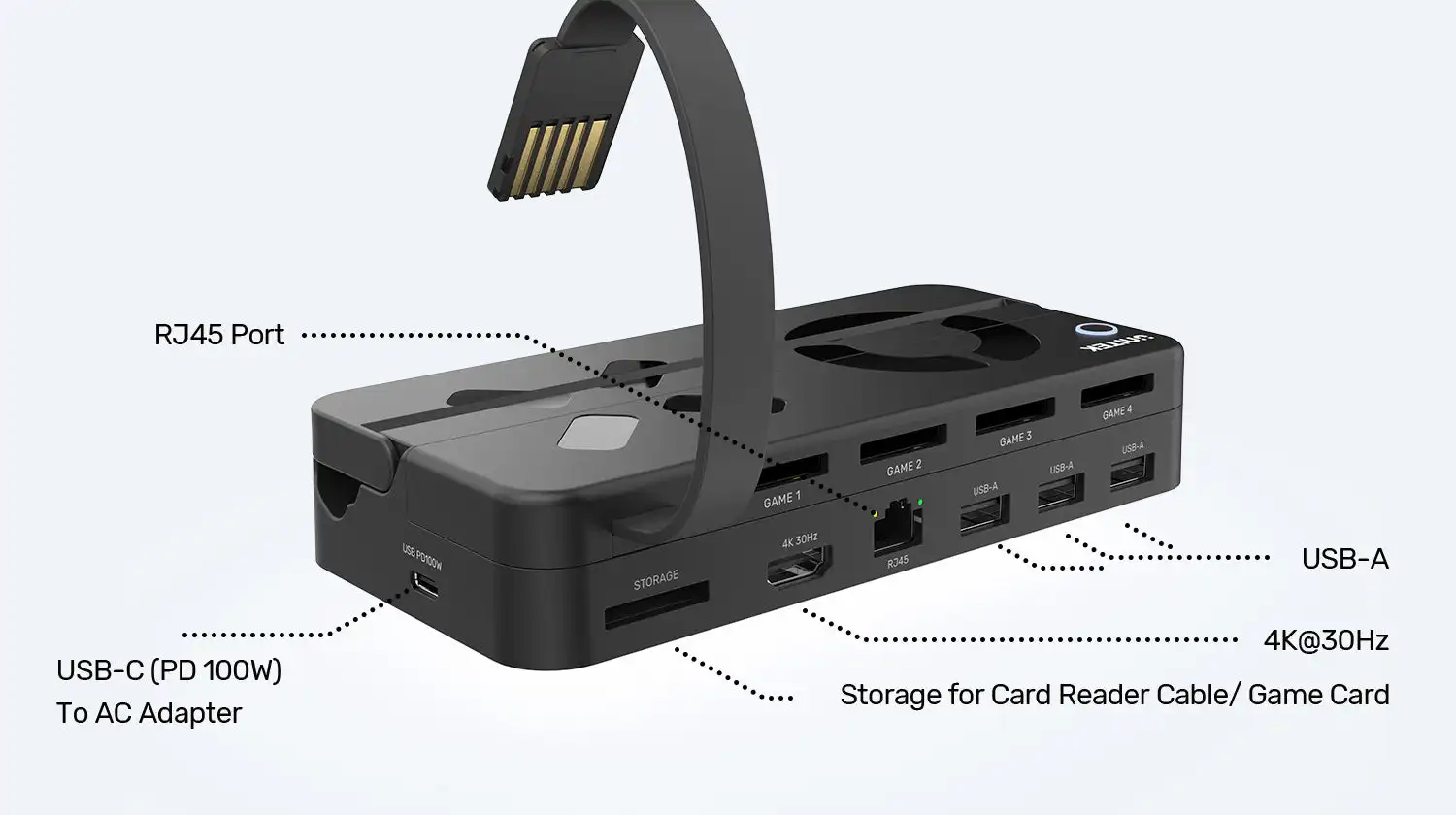 The multi-game reader can be securely fixed on top of the Switch official docking station. Users simply need to attach the game card reader to the cradle at the bottom. No worries about the ventilation vent being blocked and affecting console cooling.