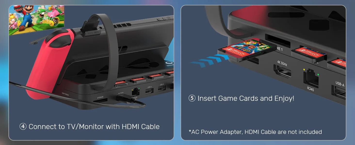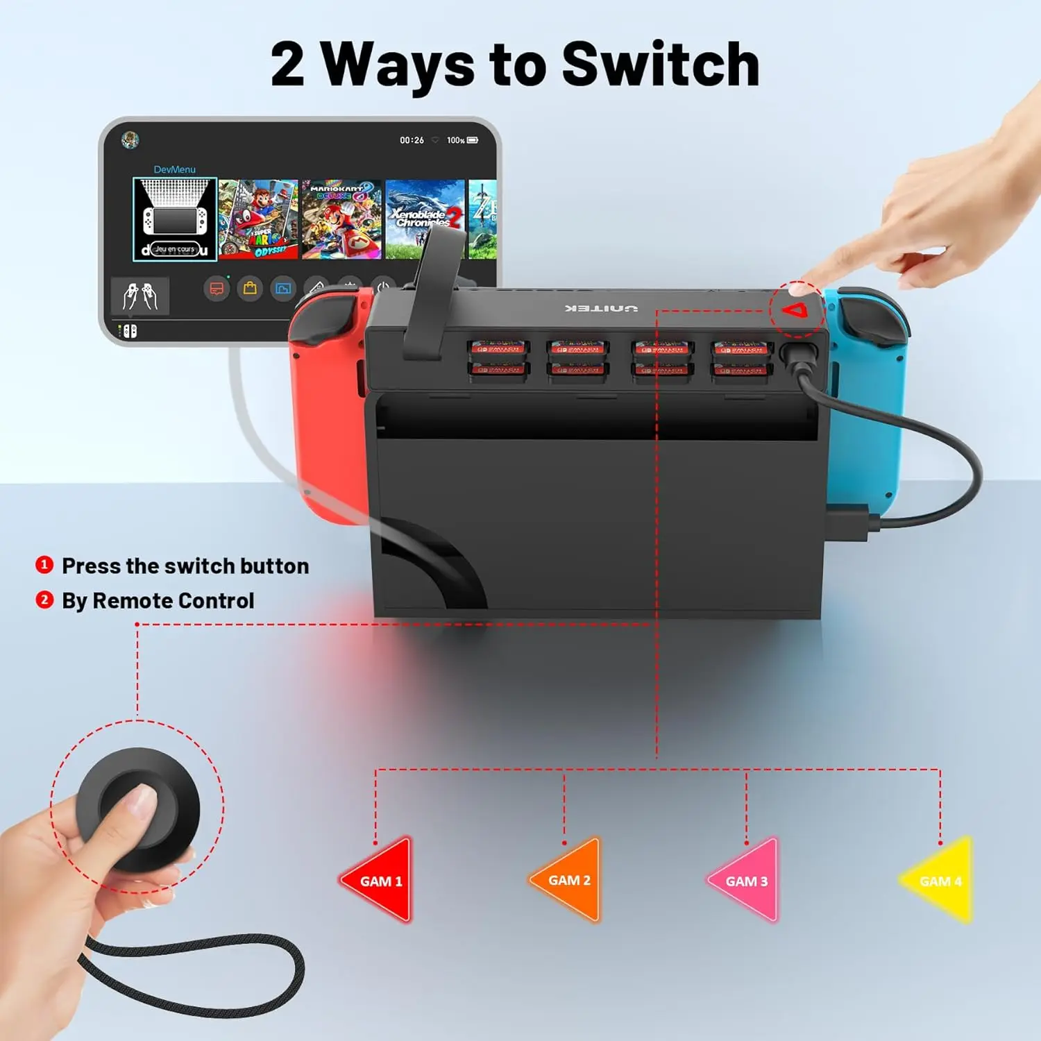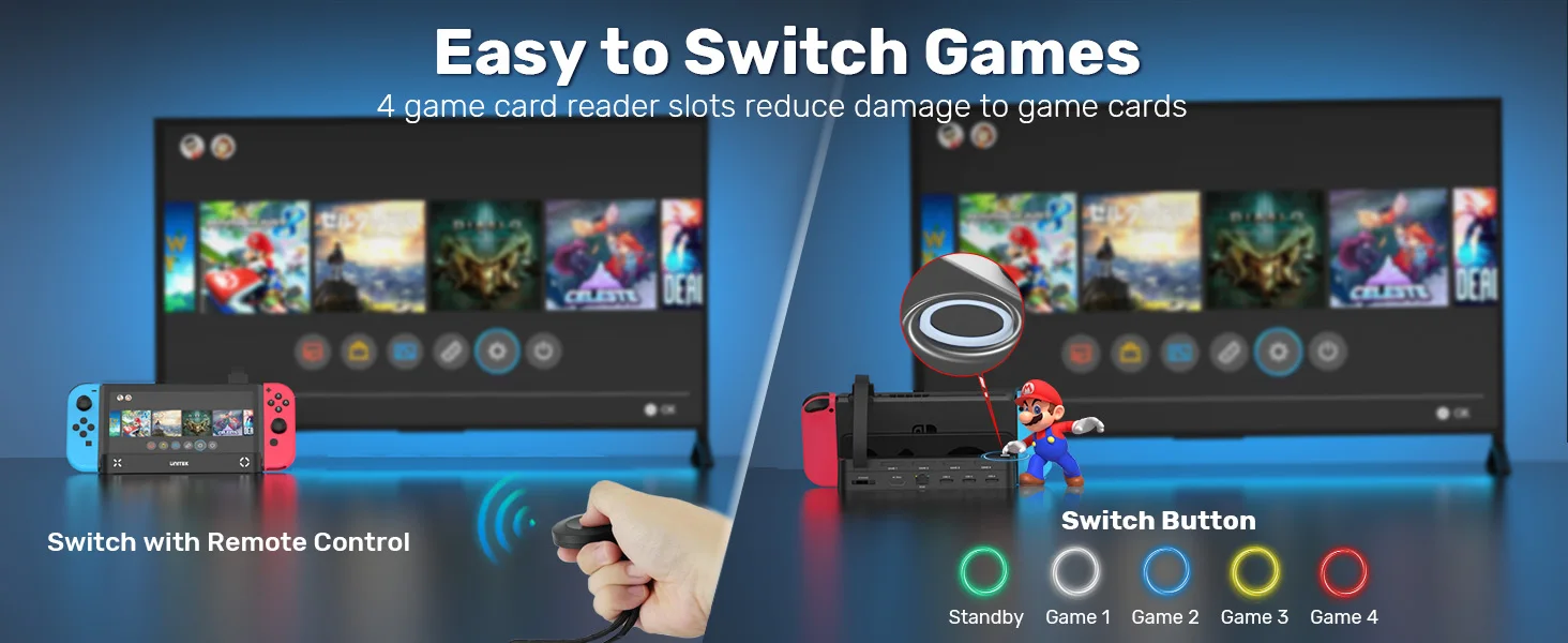 This UNITEK switch docking station performs much more than the official switch dock. It supports 4 games switching by pressing the button and is equipped with HDMI video output, USB-C (power supply), 3 USB ports and a RJ45 Gigabit Ethernet port, allowing you and your friends to play multiple games without changing the cards with WIRELESS REMOTE CONTROL.