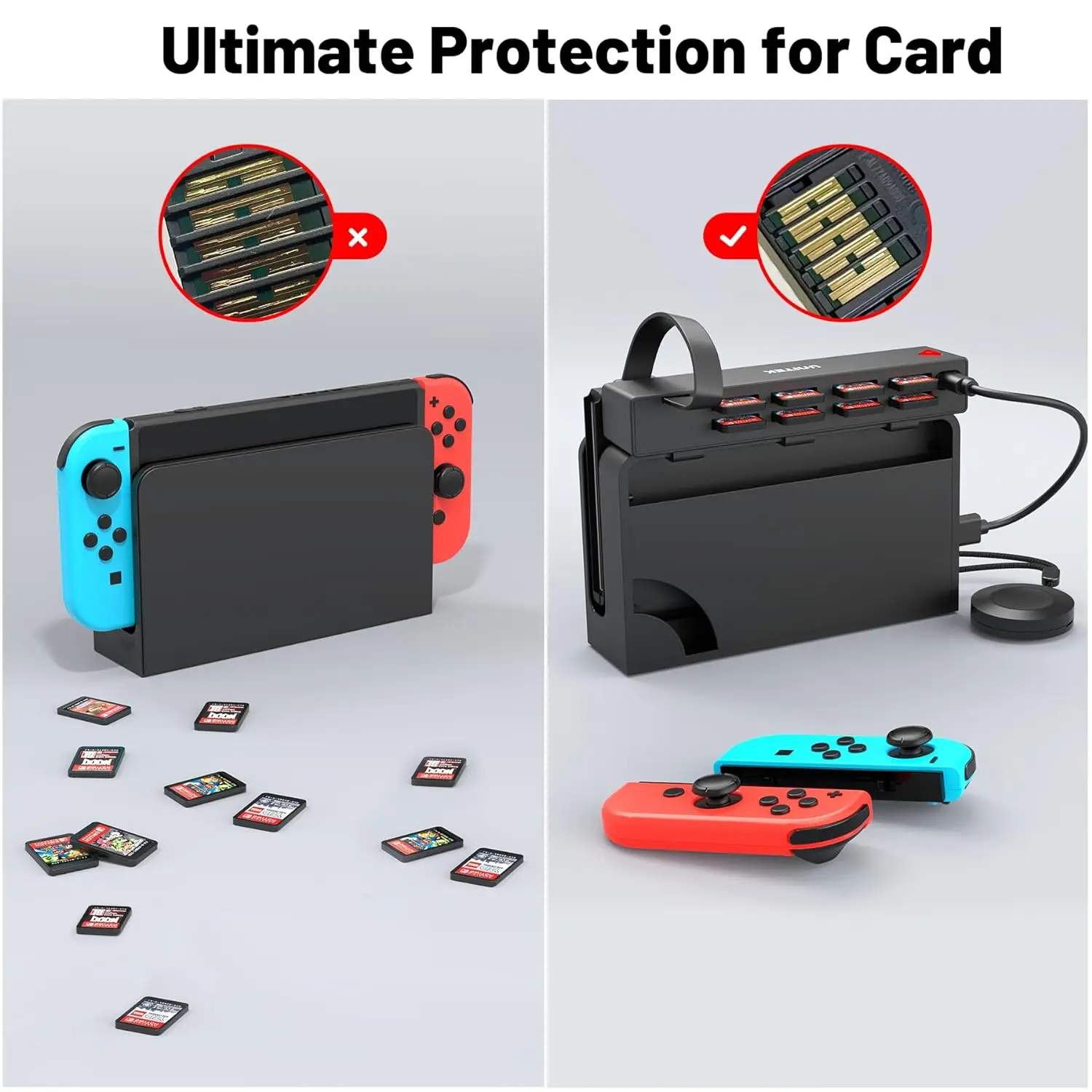 This 8-in-1 switch card reader is specially designed for Nintendo Switch/ Switch OLED, which can insert 4 cards simultaneously for reading, with one button or remote controller to switch multiple games quickly. The reader also provides 4 slots for securely storing your game cards. It's the ideal choice for gamers who are tired of constantly swapping game cards.