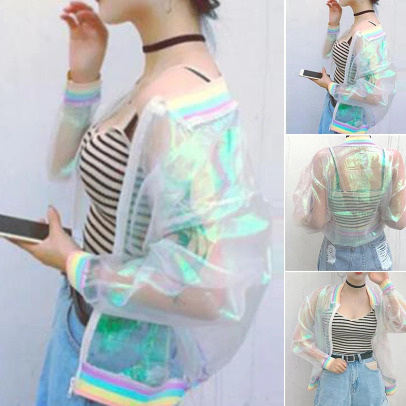 Women Iridescent Rainbow Color Organza Transparent Causal Jacket Holographic Coat Laser Sunscreen Baseball Jackets Lady Outwear