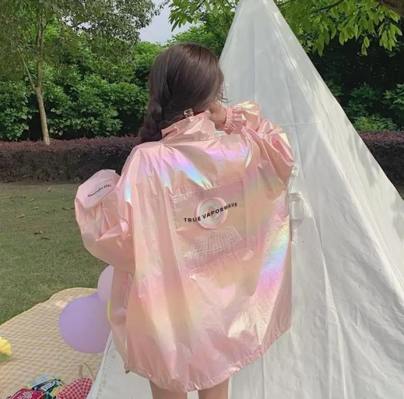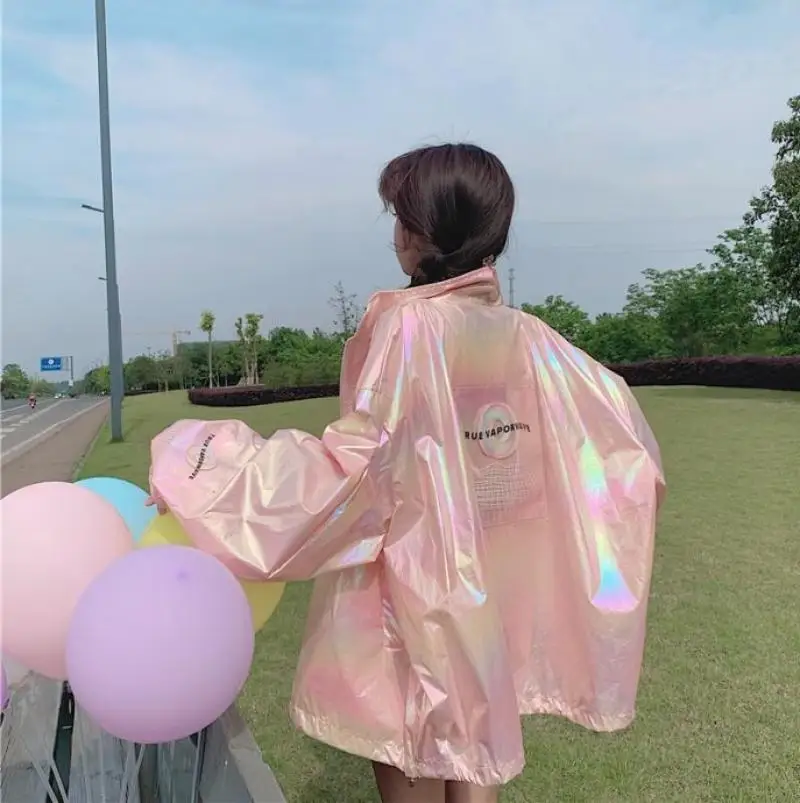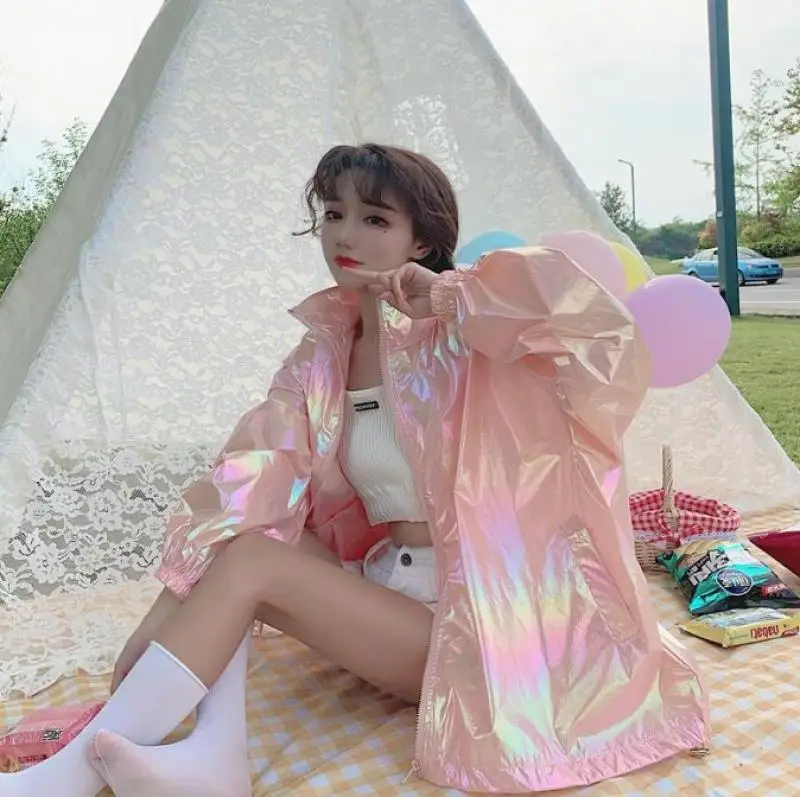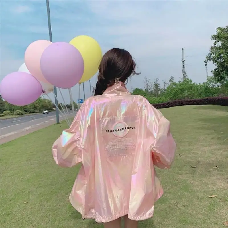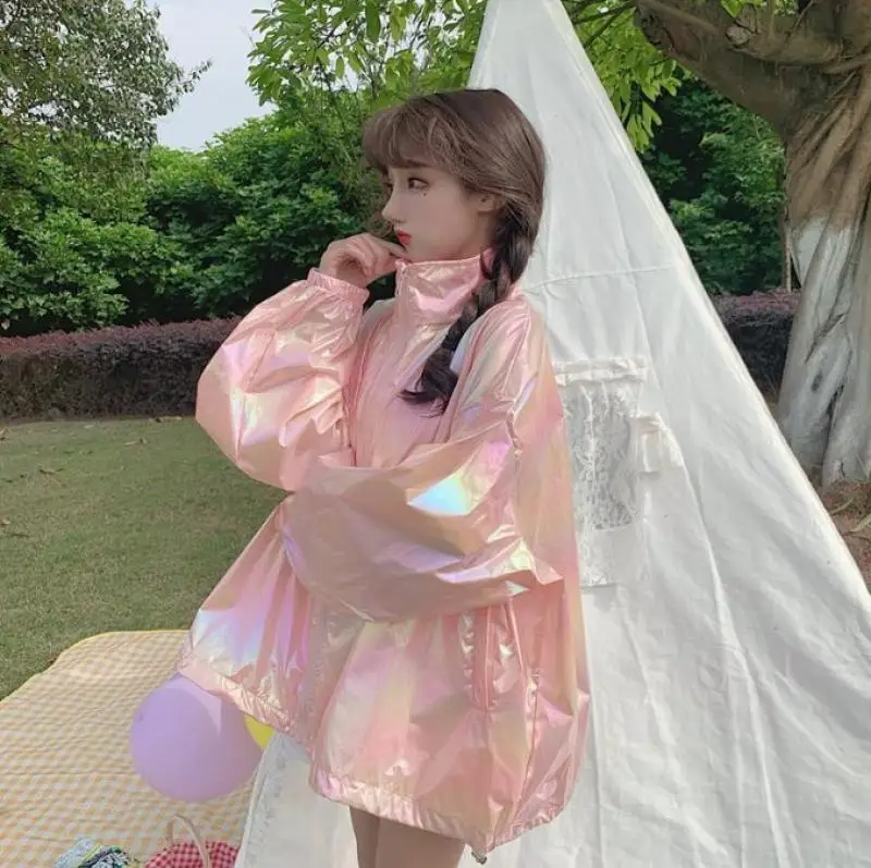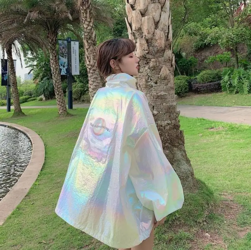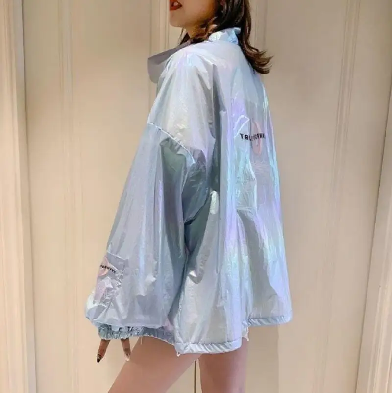 Women Summer Spring Zipped Sun Protect Shiny Stage Holographic Loose Hooded Street Hipster Long Sleeve Jacket Coat