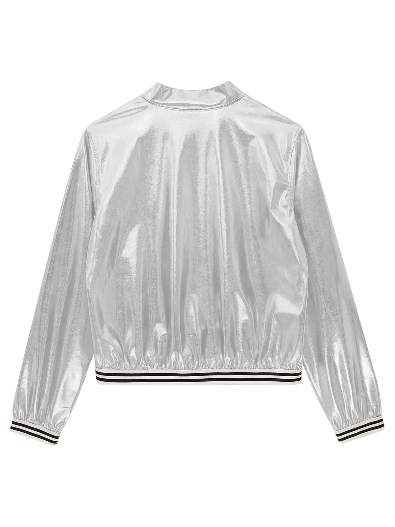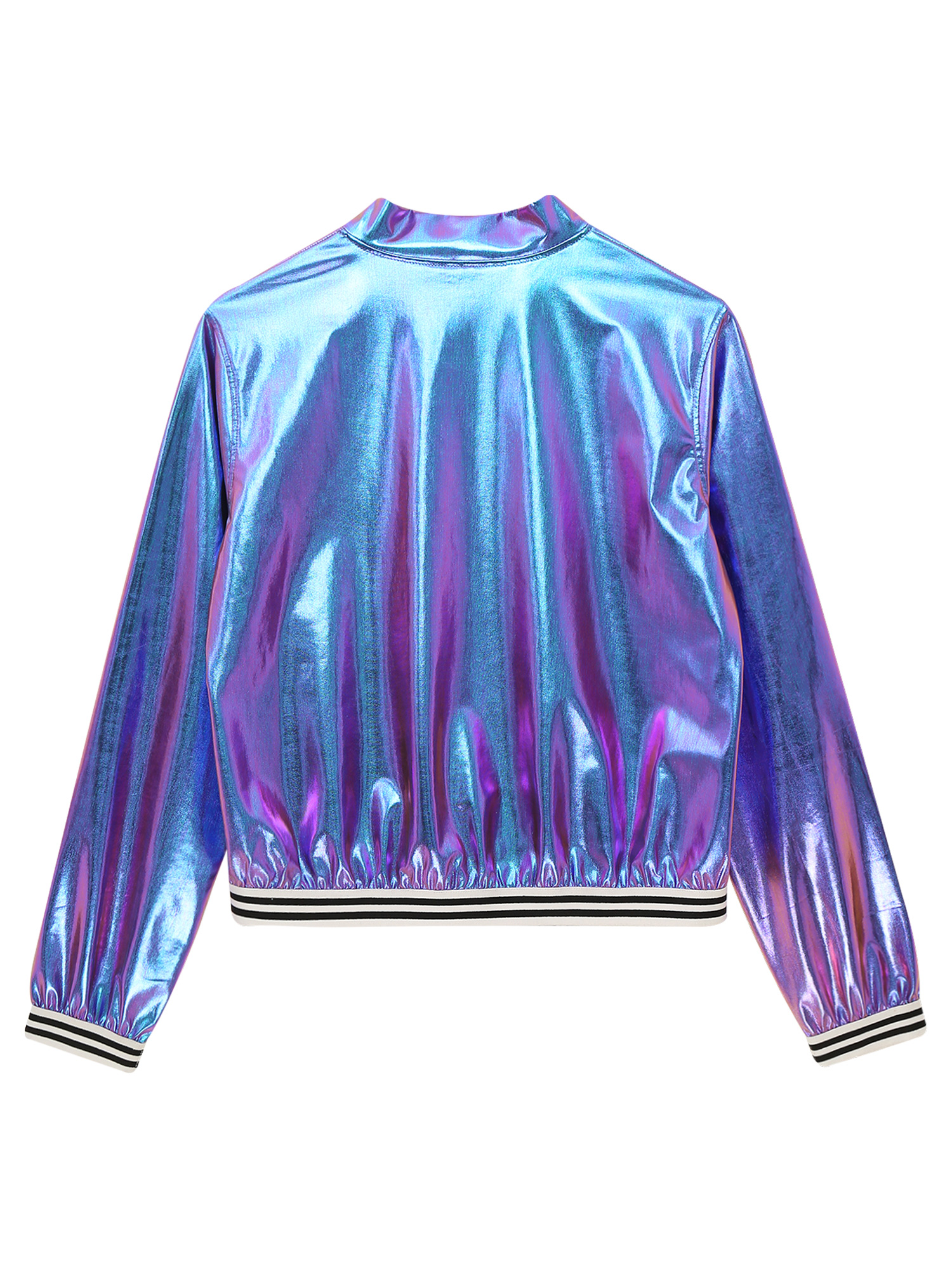 Designed with long sleeve, front zipper, elastic striped bands, holographic metallic shiny, which is a stylish bomber jacket.