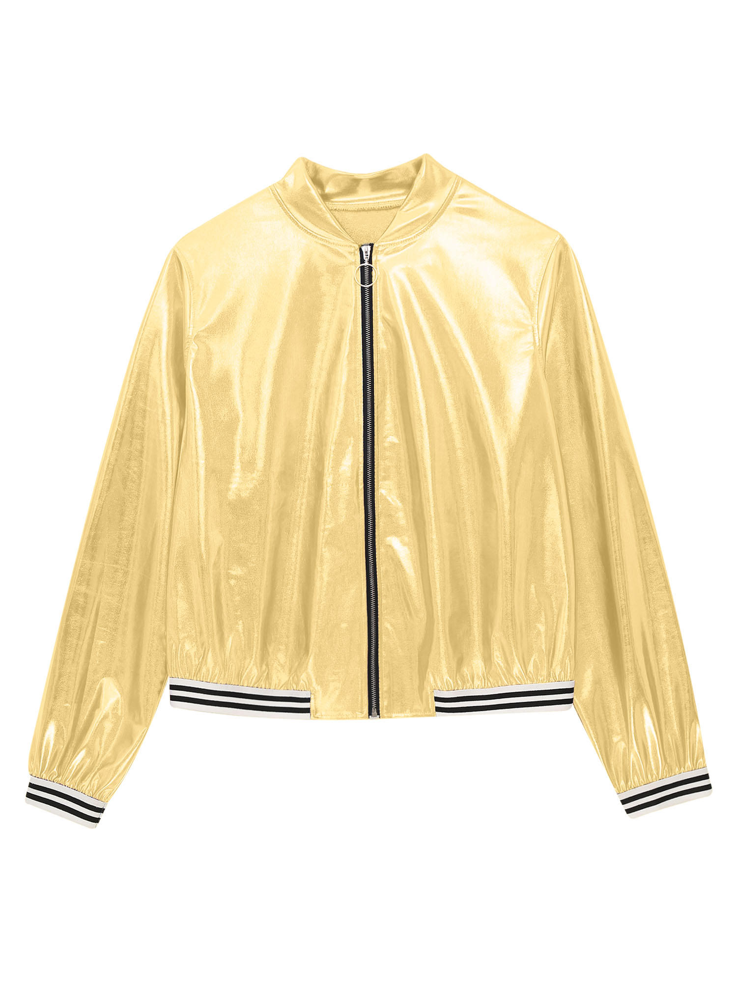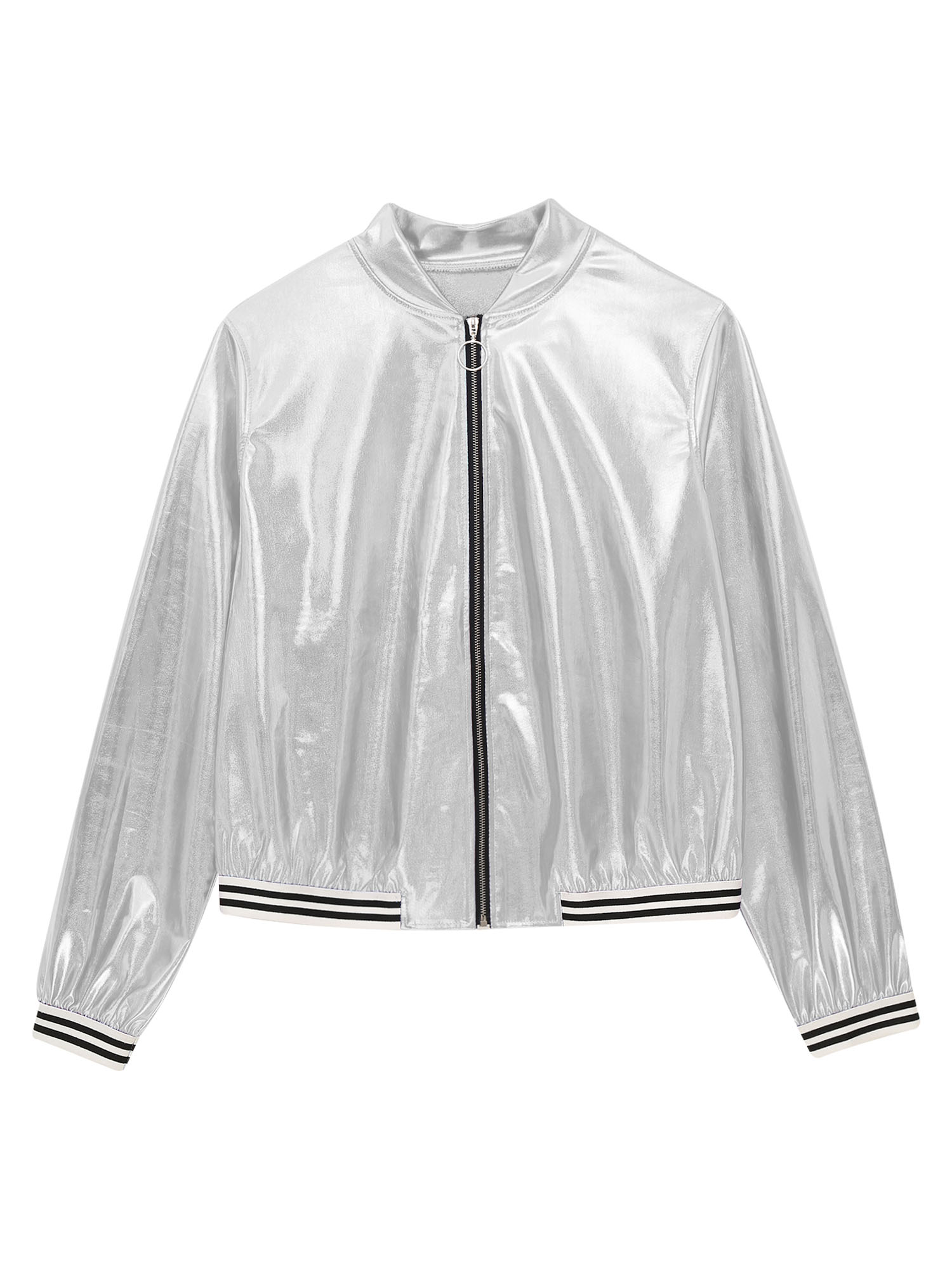 Womens Holographic Metallic Shiny Bomber Jacket Baseball Jacket Coat Long Sleeve Front Zipper Striped Band Outerwear