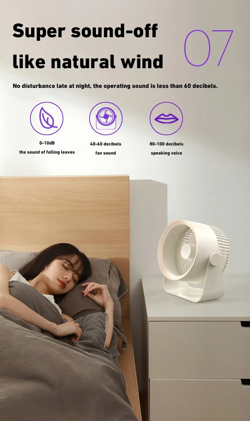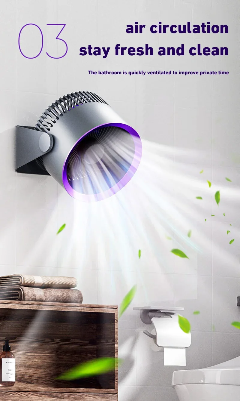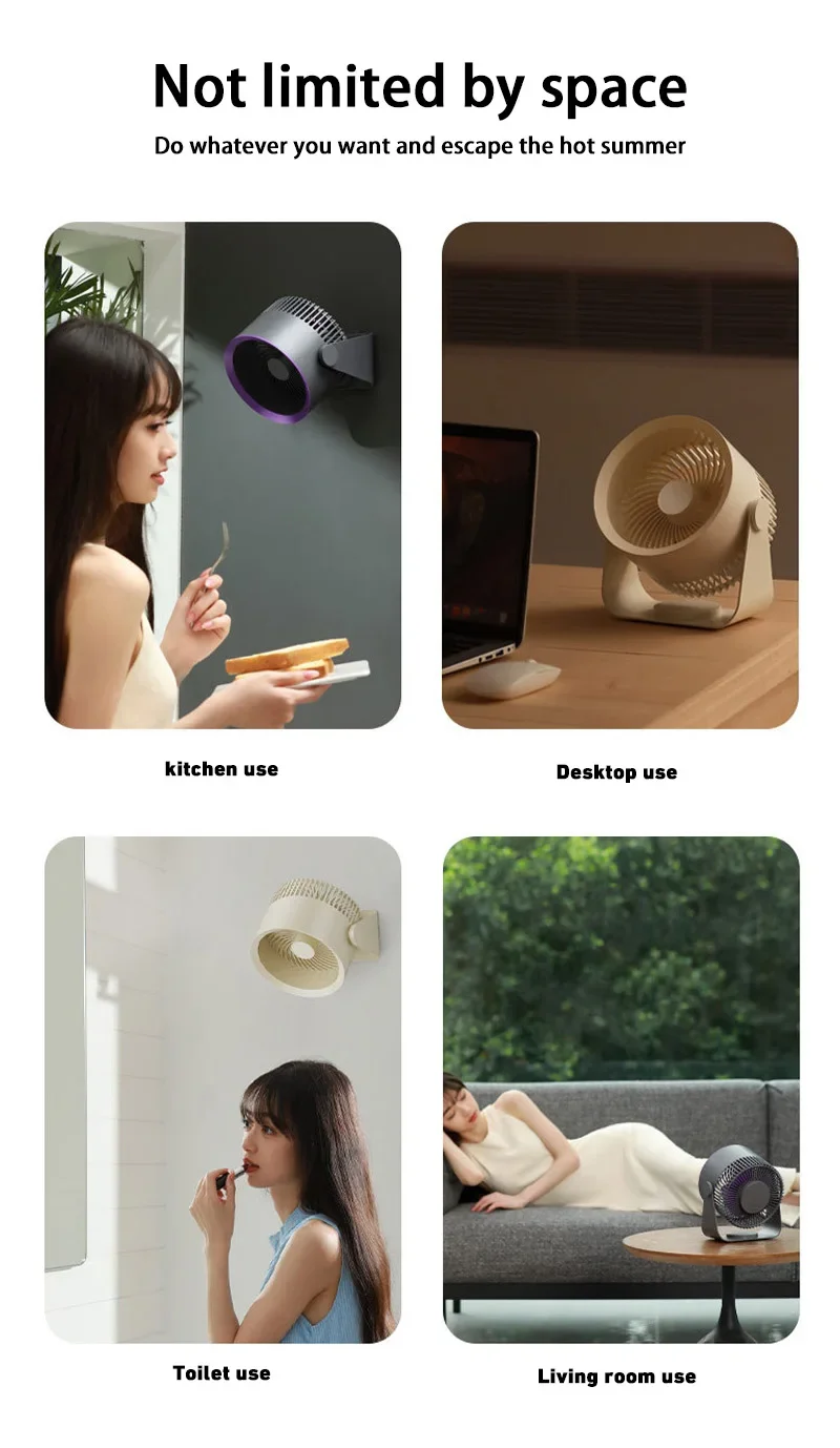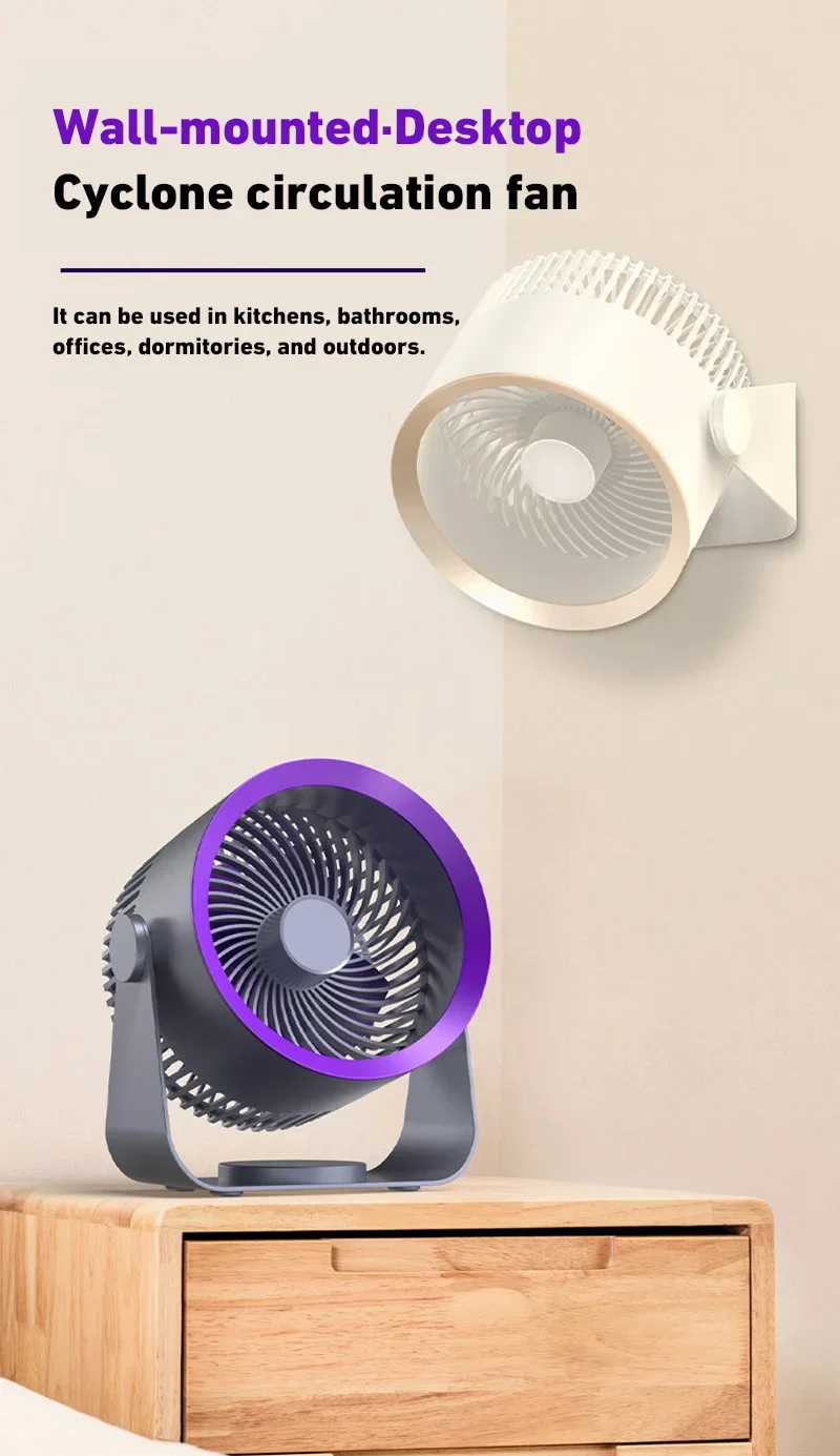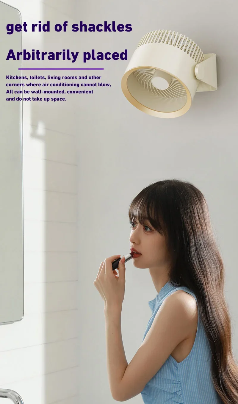 4. 360-degree rotation adjustment: The electric fan can rotate 360° up and down to supply air when placed on the desktop. After hanging on the wall, it can be manually set to rotate left and right, and the air supply range is wider.
