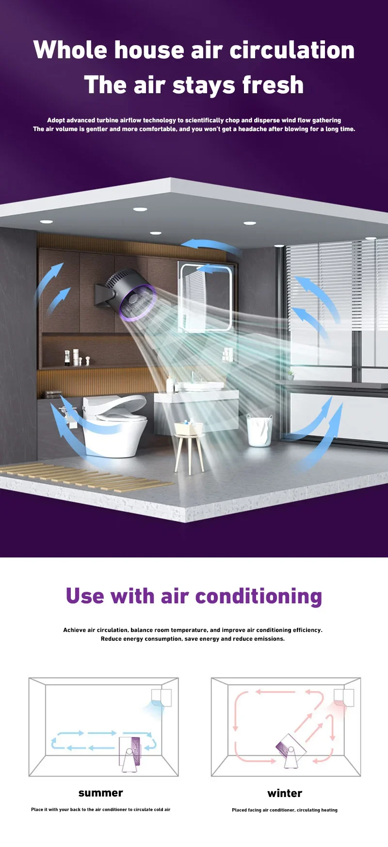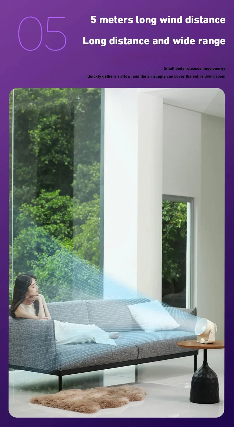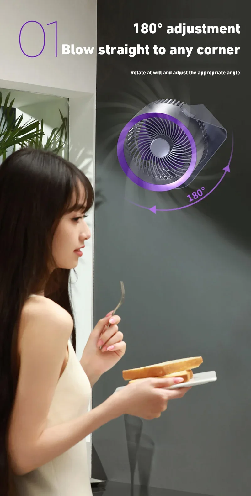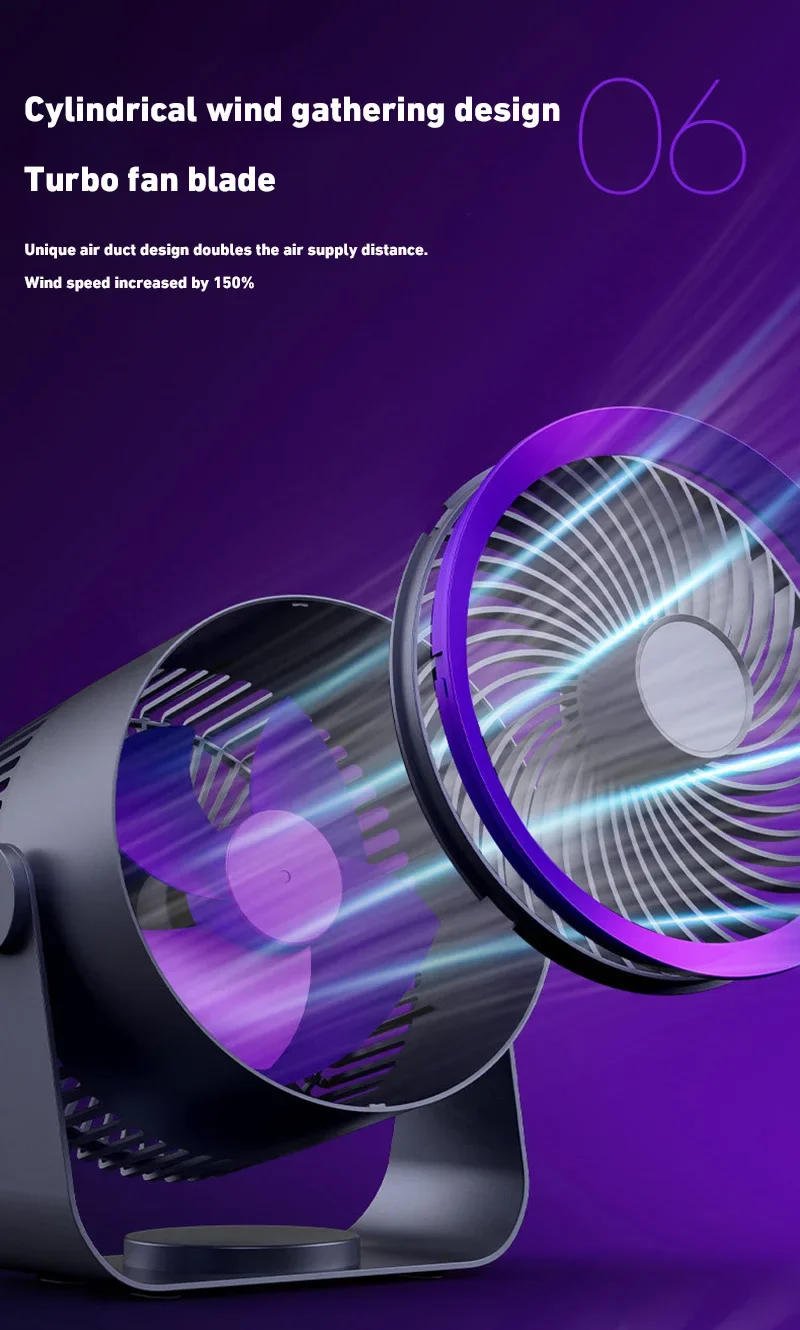 4. 360-degree rotation adjustment: The electric fan can rotate 360° up and down to supply air when placed on the desktop. After hanging on the wall, it can be manually set to rotate left and right, and the air supply range is wider.