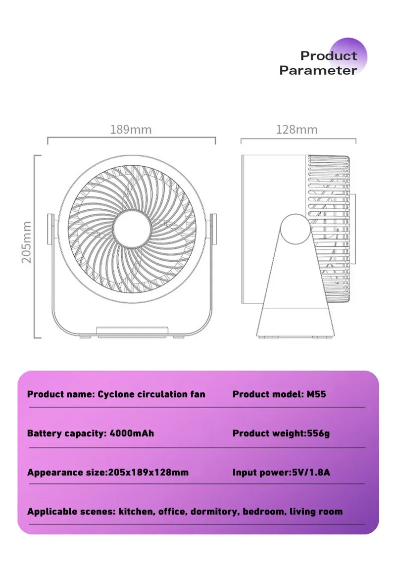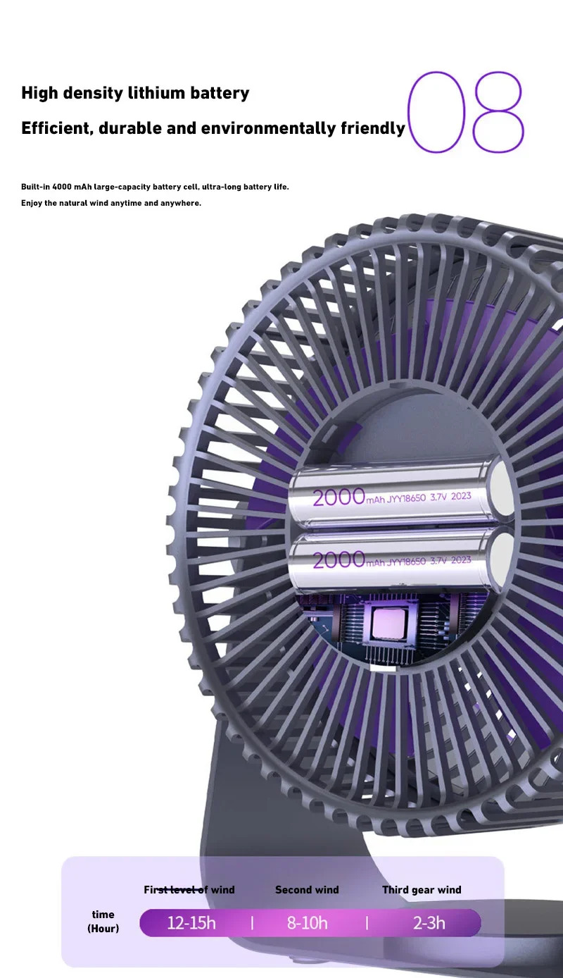 2. Large battery and long battery life: The fan includes two styles: charging and battery. It has a built-in 4000mAh large-capacity battery and can be used wirelessly for up to 15 hours.