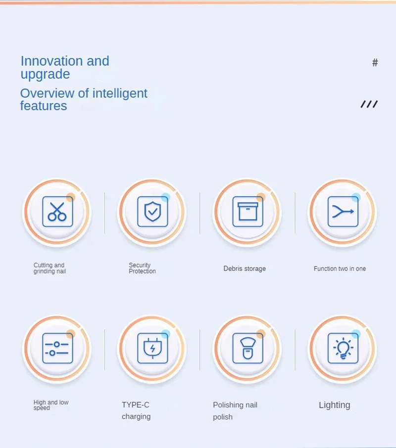 8.This product is an integrated operation of cutting, polishing and polishing. It is a normal phenomeno that slight dust like nail shavings may be generated during use.