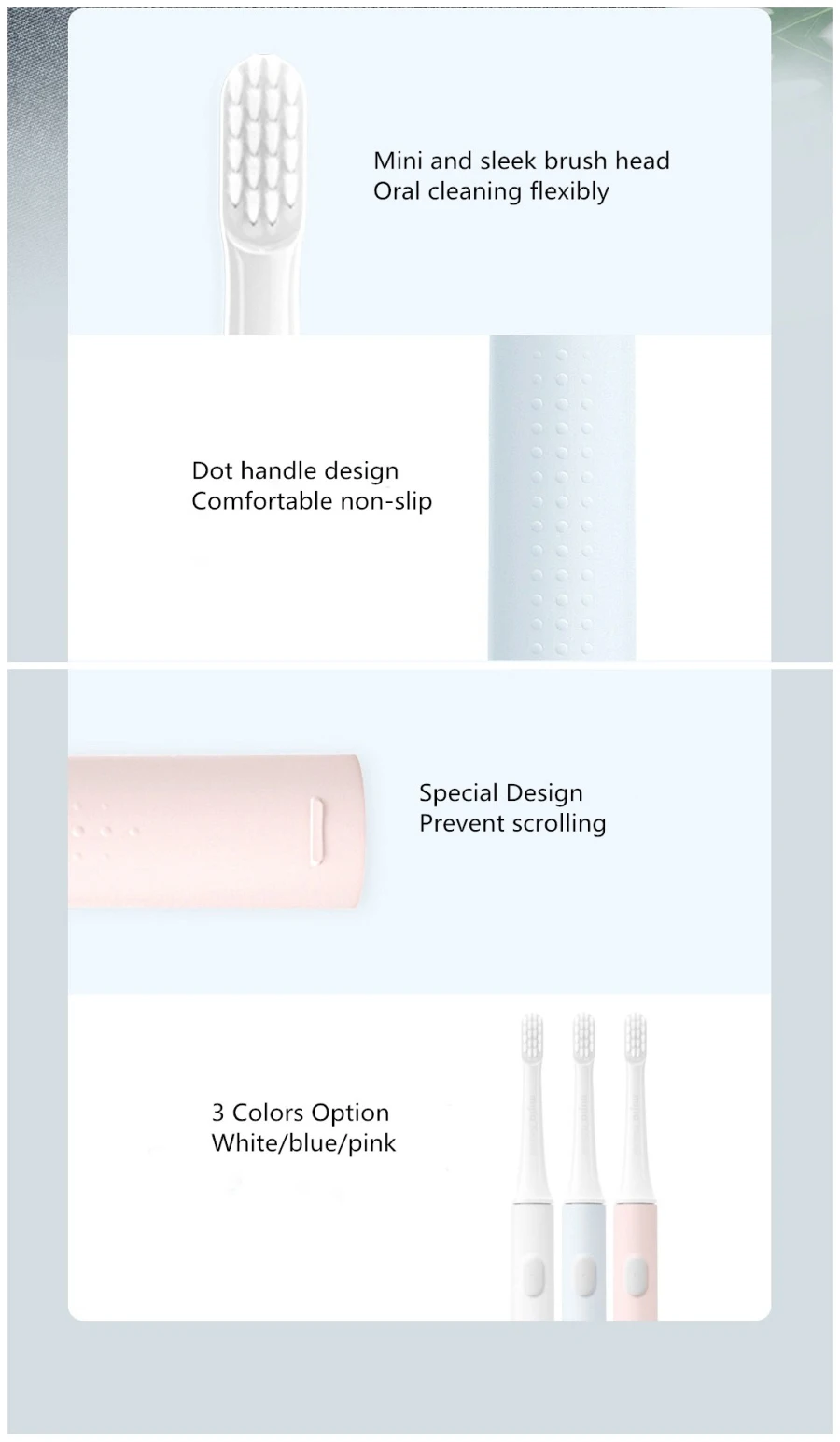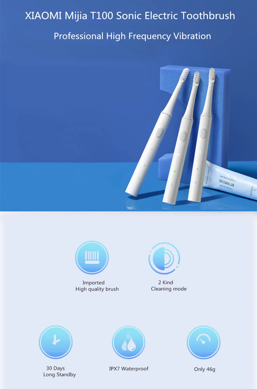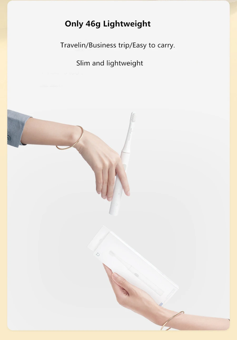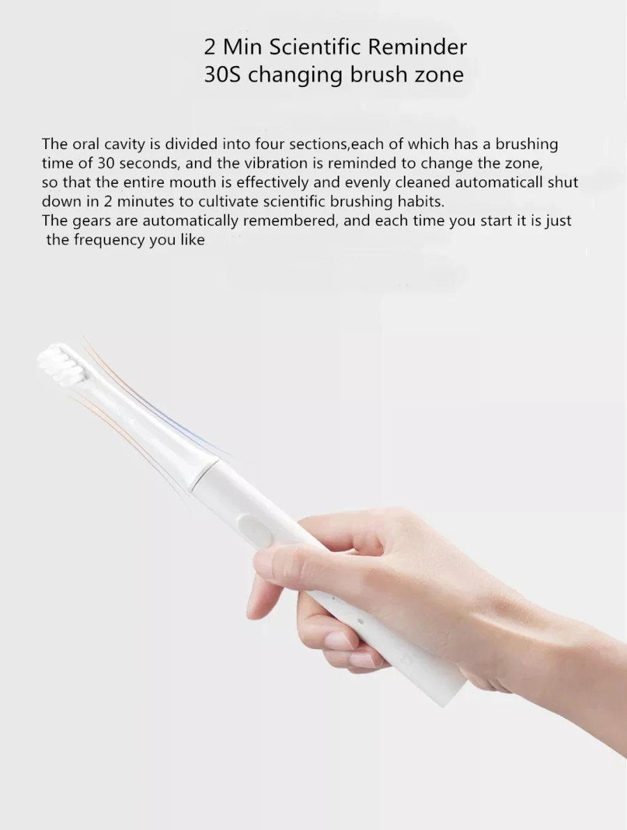 Imported delicate soft hair IPX7 body waterproof, no fear of wet water Charging time 4 hours, long battery life 30 days 2 minutes of scientific brushing 30 seconds zone reminder 16500 rpm, high frequency vibration, deep cleaning of the mouth Professional high frequency vibration, cleaner brushing method Two-speed cleaning mode Strength is more comfortable at home: Standard cleaning mode, stronger Every 30 seconds, the zone will be changed by a short stop, and it will automatically stop after 2 minutes. 46g portable light electric toothbrush, professional high frequency vibration to clean teeth, imported slim soft hair care gums 3 seconds gradual strong start function, prevent droplets, give the mouth a cushioning period, effectively avoid gum discomfort