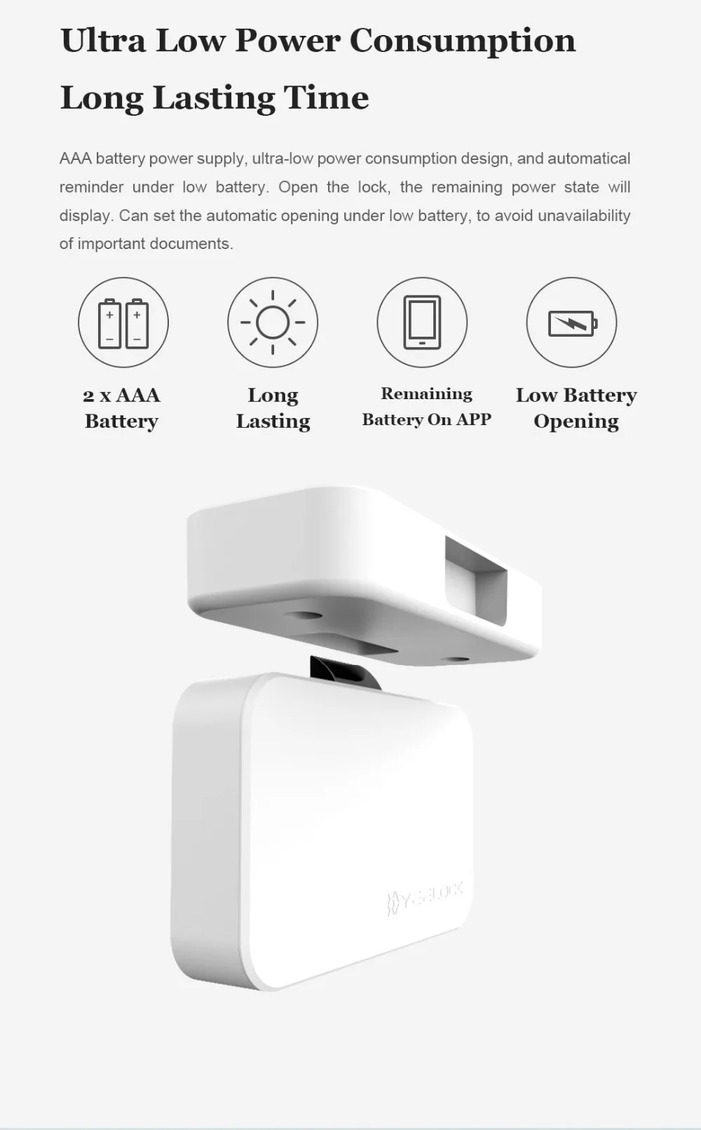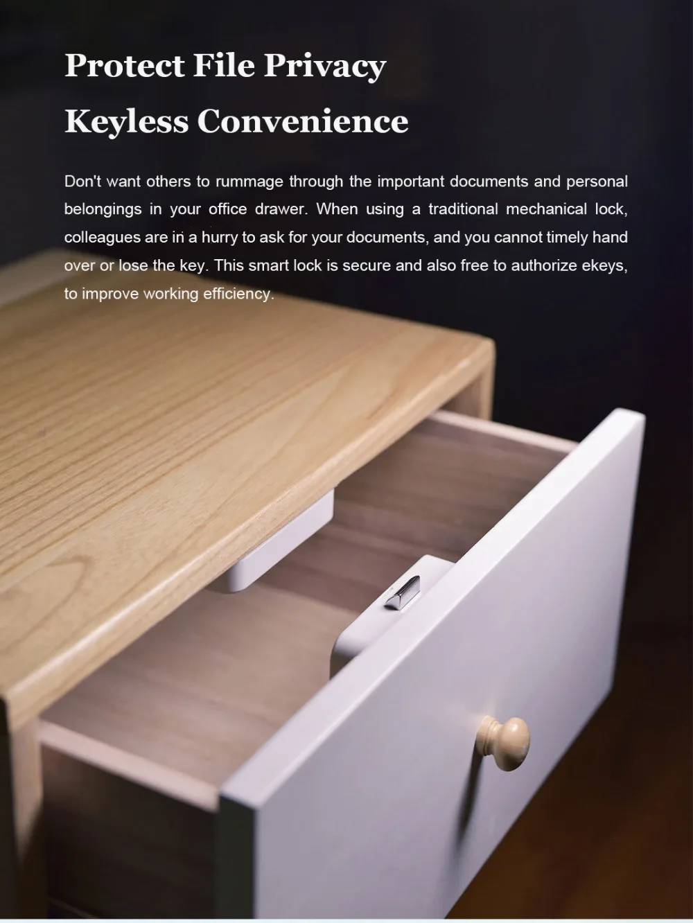 Features:1. Phone Replaces Key, One Click To OpenYour phone is the key. after binding your account, you will never worry about losing keys. It can be opened via Bluetooth connection easily. Whether bookcase or bedside table or file cabinet, it can perfect fit.2. Care About Baby's SafetyAway From Medicines & Sharp ThingsBaby is curious about all the things around him? Worried that he might eat medicine by mistake or get hurt by a sharp object? This drawer lock is a great way to protect your baby from potential dangers.3. Protect File Privacy, Keyless ConvenienceDon't want others to rummage through the important documents and personal belongings in your office drawer. When using a traditional mechanical lock, colleagues are in a hurry to ask for your documents, and you cannot timely hand over or lose the key. This smart lock is secure and also free to authorize ekeys, to improve working efficiency.4. Ultra Low Power Consumption, Long Lasting TimeAAA battery power supply, ultra-low power consumption design, and automatical reminder under low battery. Open the lock, the remaining power state will display. Can set the automatic opening under low battery, to avoid unavailability of important documents.5. Applicable to Sorts of CabinetsThis item can be installed in wooden, iron, PVC and other materials drawer and cabinets, from home to office, all enjoy the intelligent life.